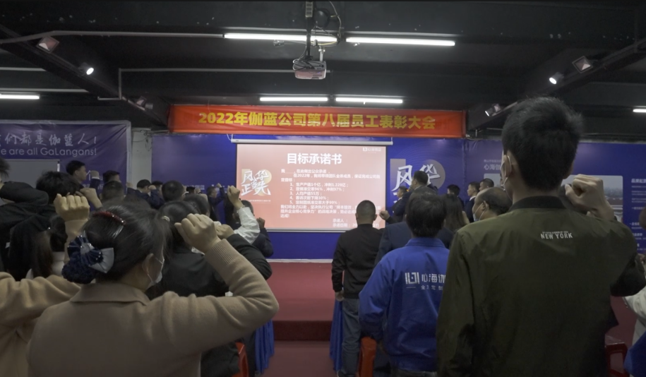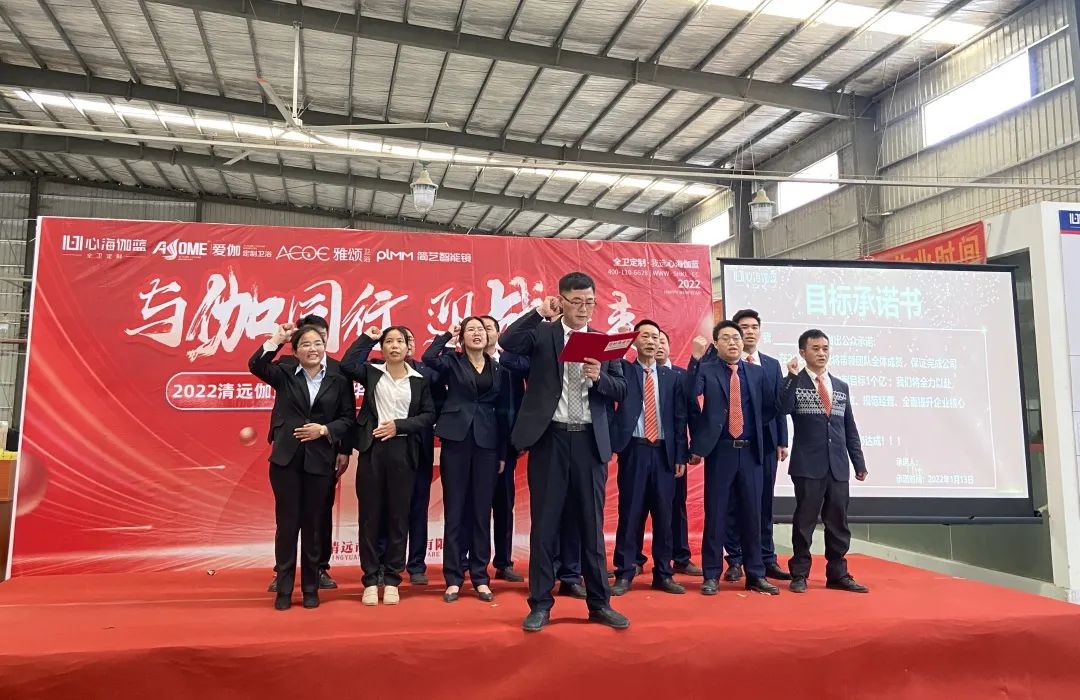 2022的目标宣誓环节将表彰大会推向了高潮,佛山伽蓝、清远伽蓝、营销中心、赢伽电商、凯庭淋浴房、雅颂卫浴,艾素出口各分公司事业部分别进行了激扬的宣誓。
