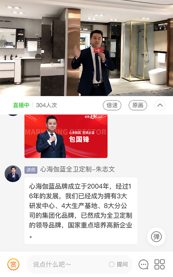 为让直播间的意向经销商伙伴们能够直观且深入了解产品,心海伽蓝营销总监包国锋带着大家云逛展厅,