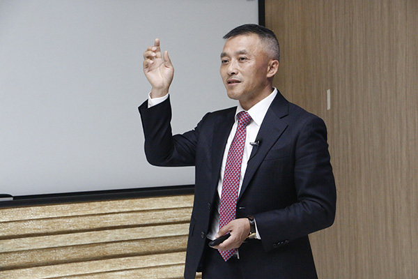 在《塑造伽蓝人才价值》课程中,伽蓝公司董事长张爱民重点以“感恩、诚信、务实、创新”的伽蓝核心价值观进行分享,