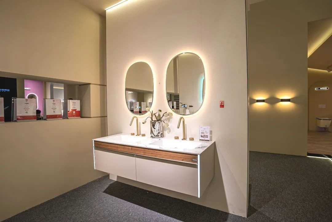 心海伽蓝展位现场展出10余款新品,包含典雅中式、法式浪漫,极简高奢的成品浴柜、亦有雅奢高定系列与纤凝东方美学等全卫产品,新品系列线条优美,间或典雅古韵,间或极简自然。