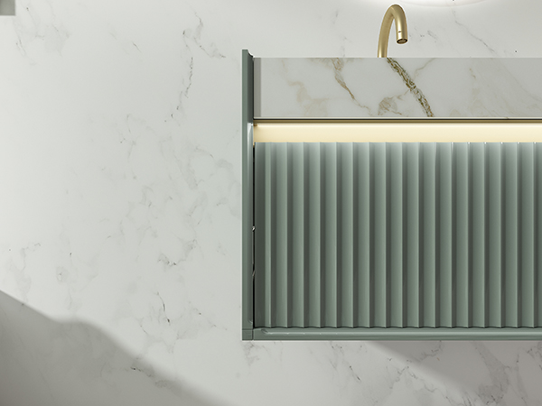 柜门以波浪线条设计凹凸有致,流动的线条极富立体感 主柜更设红外人体感应灯系统,