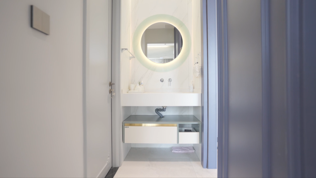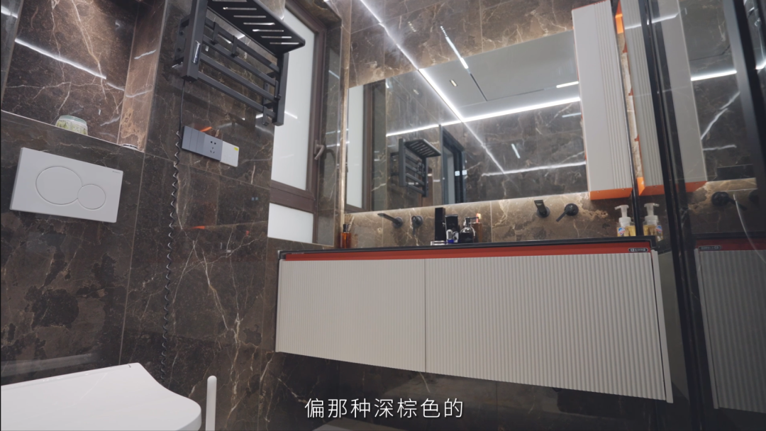 一楼外卫的空间较小,经过反复量尺对照,一套精巧美观的浴室柜恰当地出现在那里。镜面的搭配设计与钱女士家中的法式风格非常匹配,清新的绿色板材也恰到好处。主卫的维克深灰岩板搭配深黑色瓷砖表现出色,主柜的红色点缀增加了卫浴间的活泼与灵动。