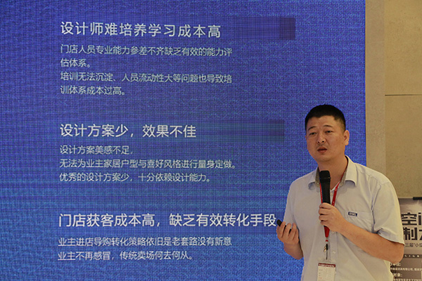 爱伽副总经理熊礼在会上指出目前全卫定制终端门店设计师所面临的痛点,提出了酷家乐设计圈的解决方案发布,