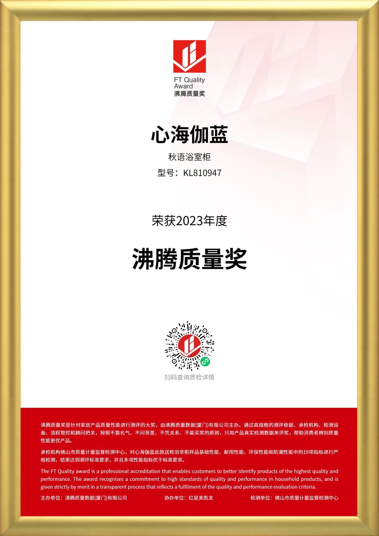 在2023年10月沸腾质量奖测评中,心海伽蓝参评的半山云境浴室柜(KL810933)、秋语浴室柜(KL810947),荣获“沸腾质量奖”。承检机构佛山市质量计量监督检测中心,对心海伽蓝以上两款送检浴室柜样品基础性能、耐用性能、环保性能和防潮性能中的19项指标进行严格检测,结果均达到测评标准要求,并且多项性能指标优于标准要求。