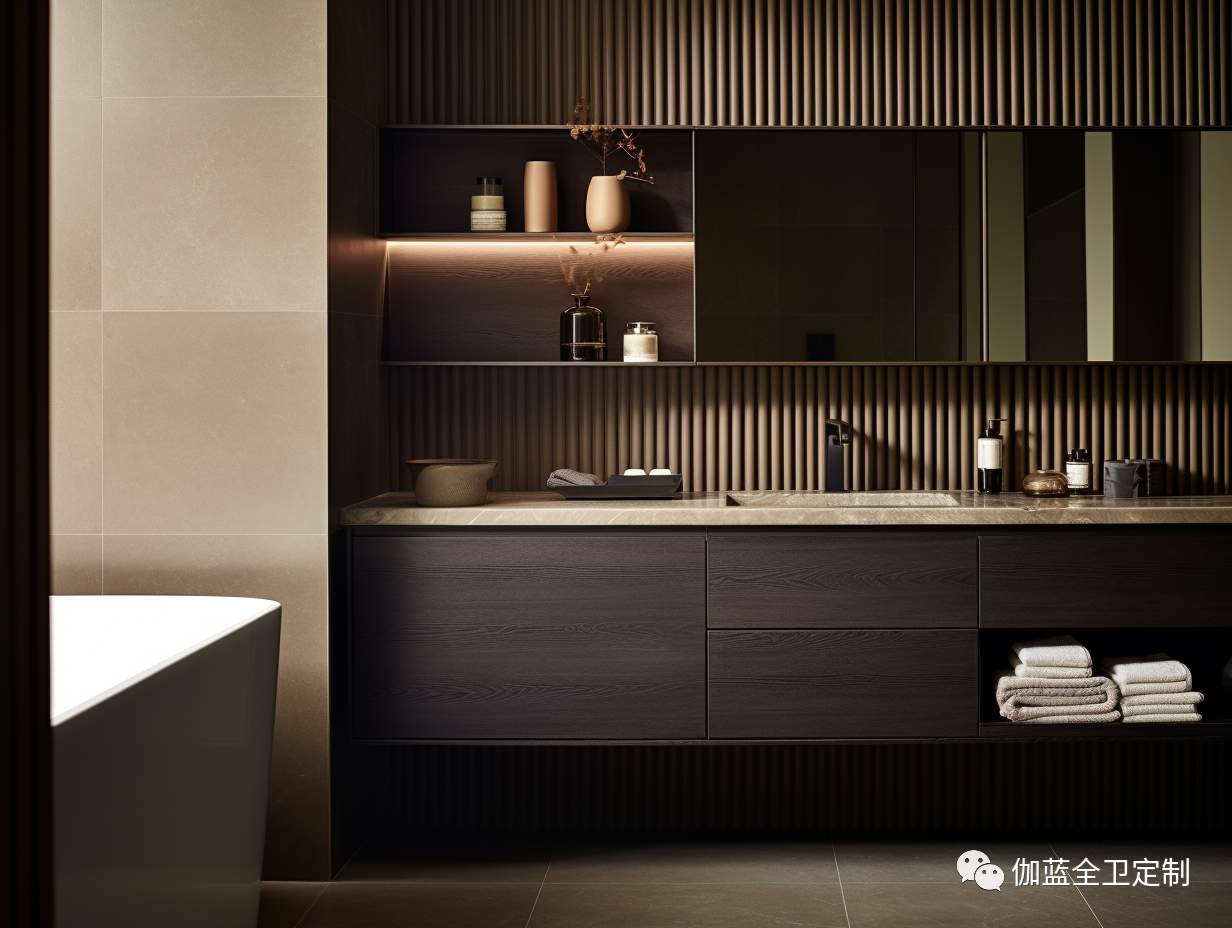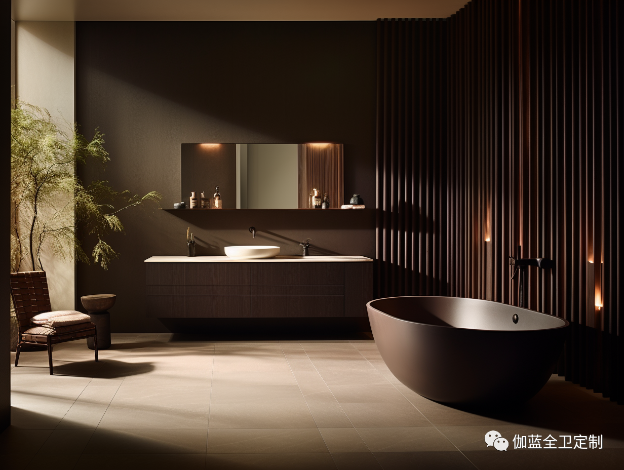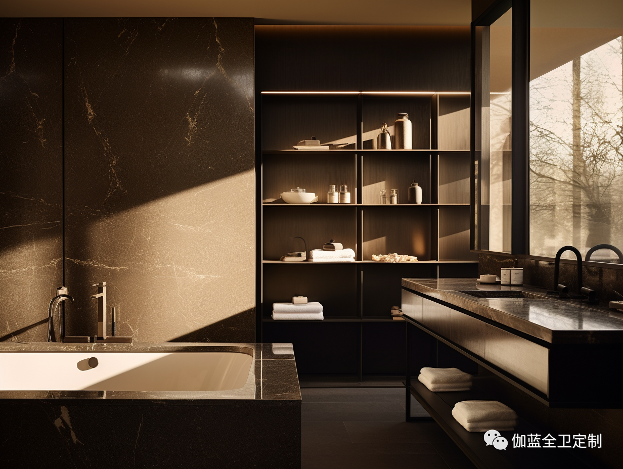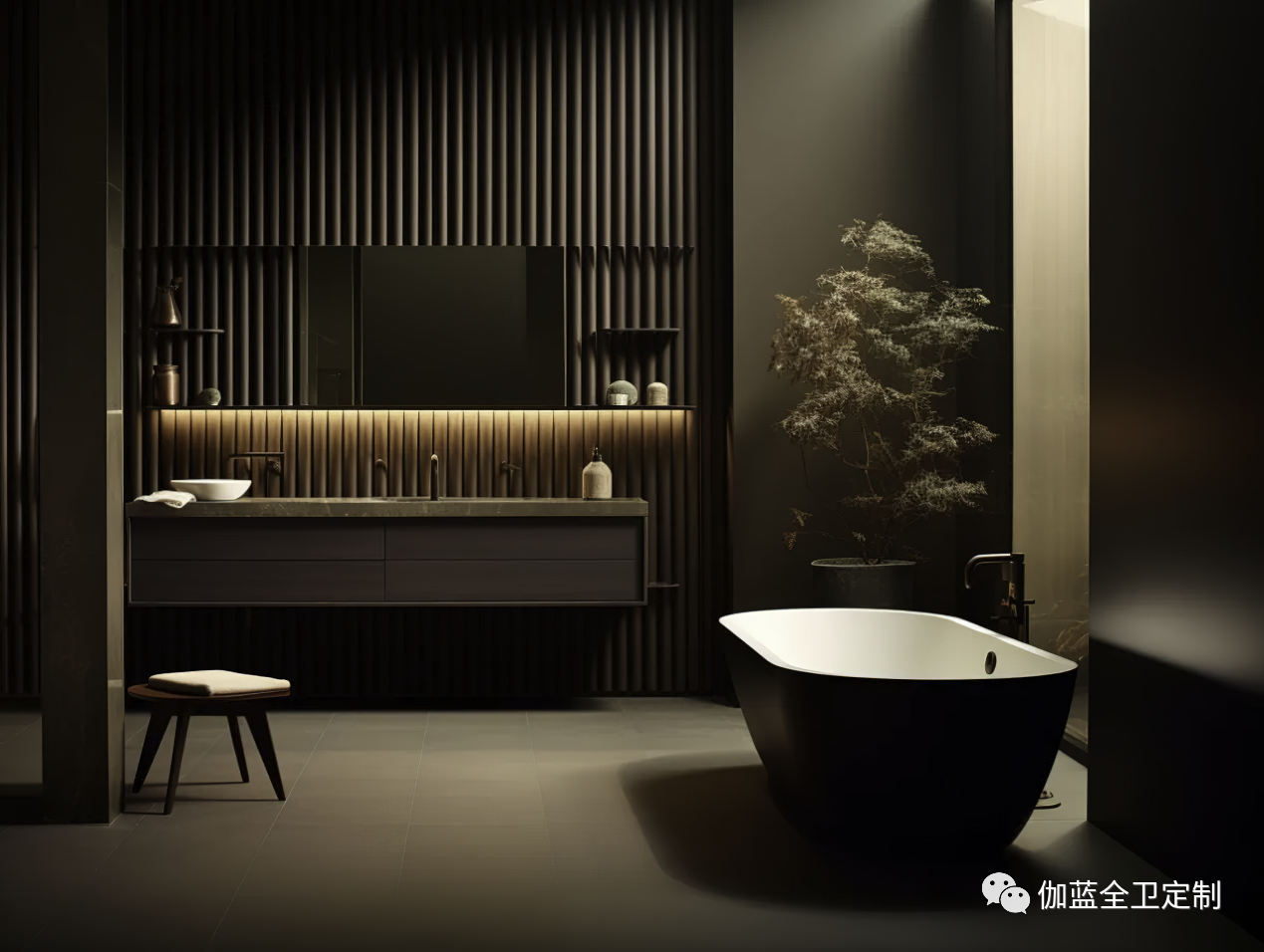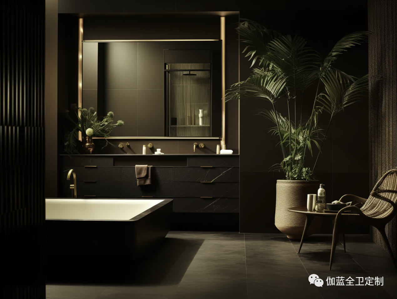 黑色主调的卫浴空间与巧妙运用光相结合,产生强烈对比、突显特定区域、营造柔和氛围、创造反射与投影效果、以及强化空间感,呈现出深邃、高贵、神秘的魅力,赋予空间独特的视觉魔力和引人注目的效果。