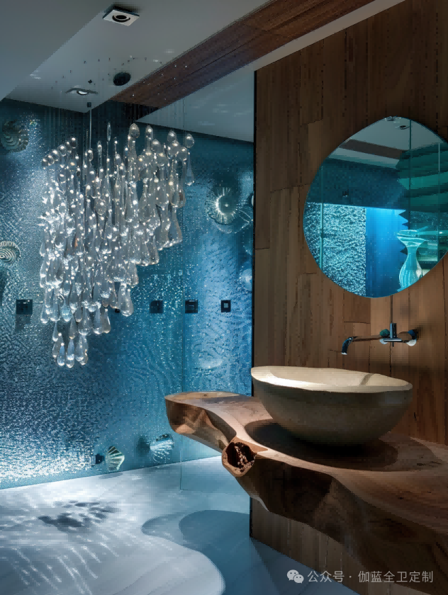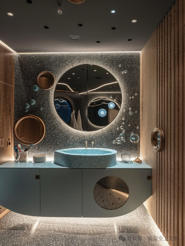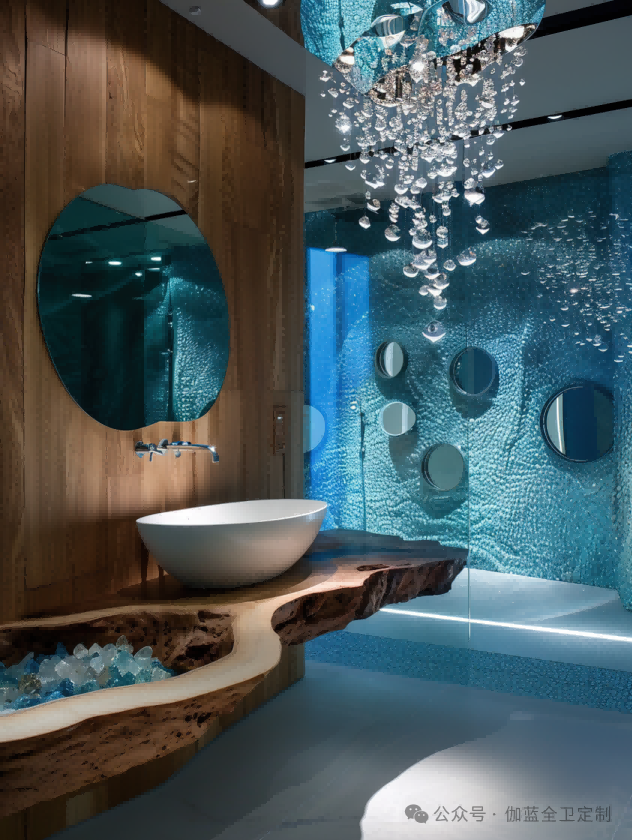 深邃的海蓝,搭配灵动的气泡,圆形镜面如同深海探险者的观察窗。独特的灯光设计如同深海中的一点星光,为现代感与科技感的融合提供了完美的注解。