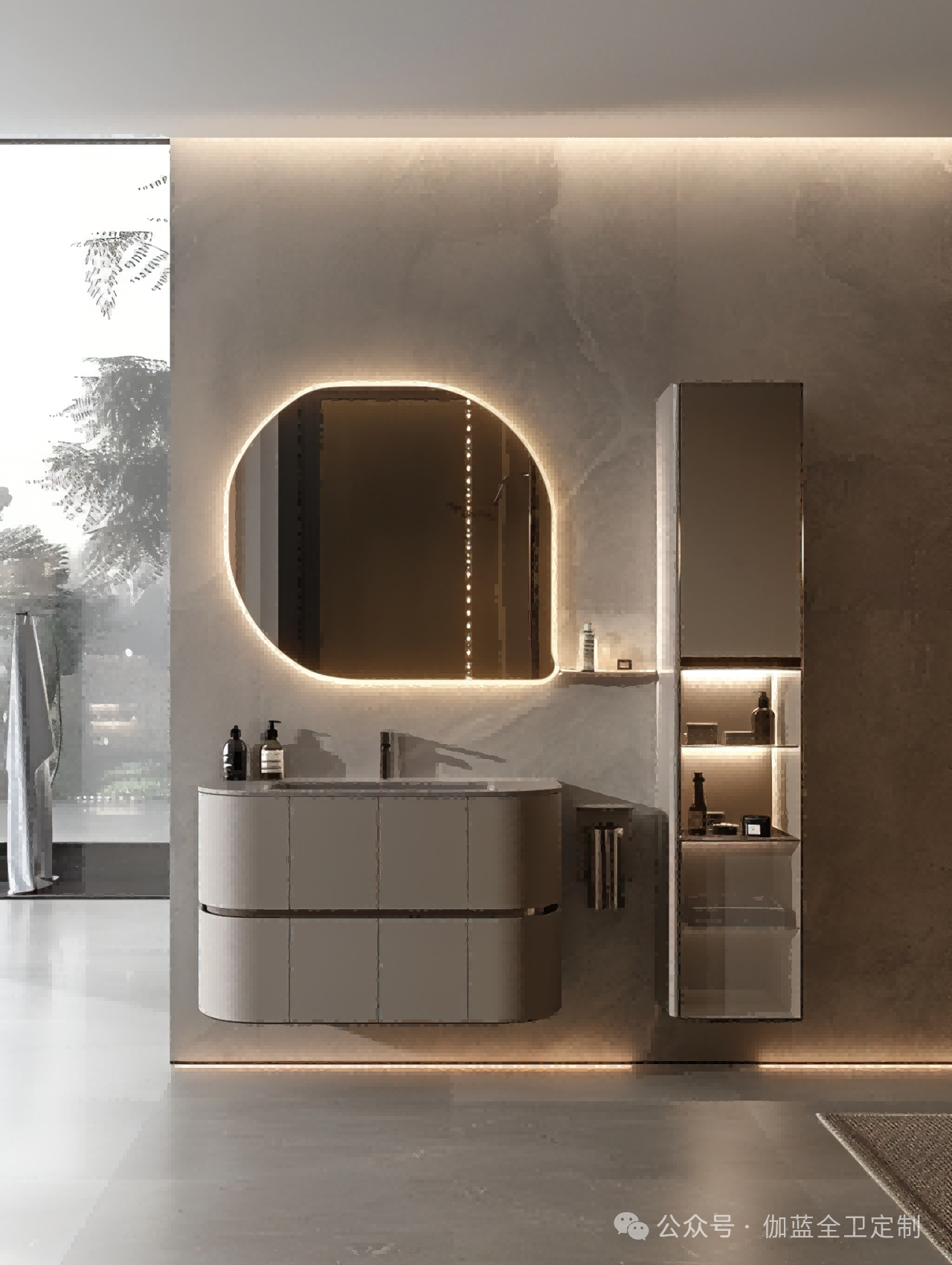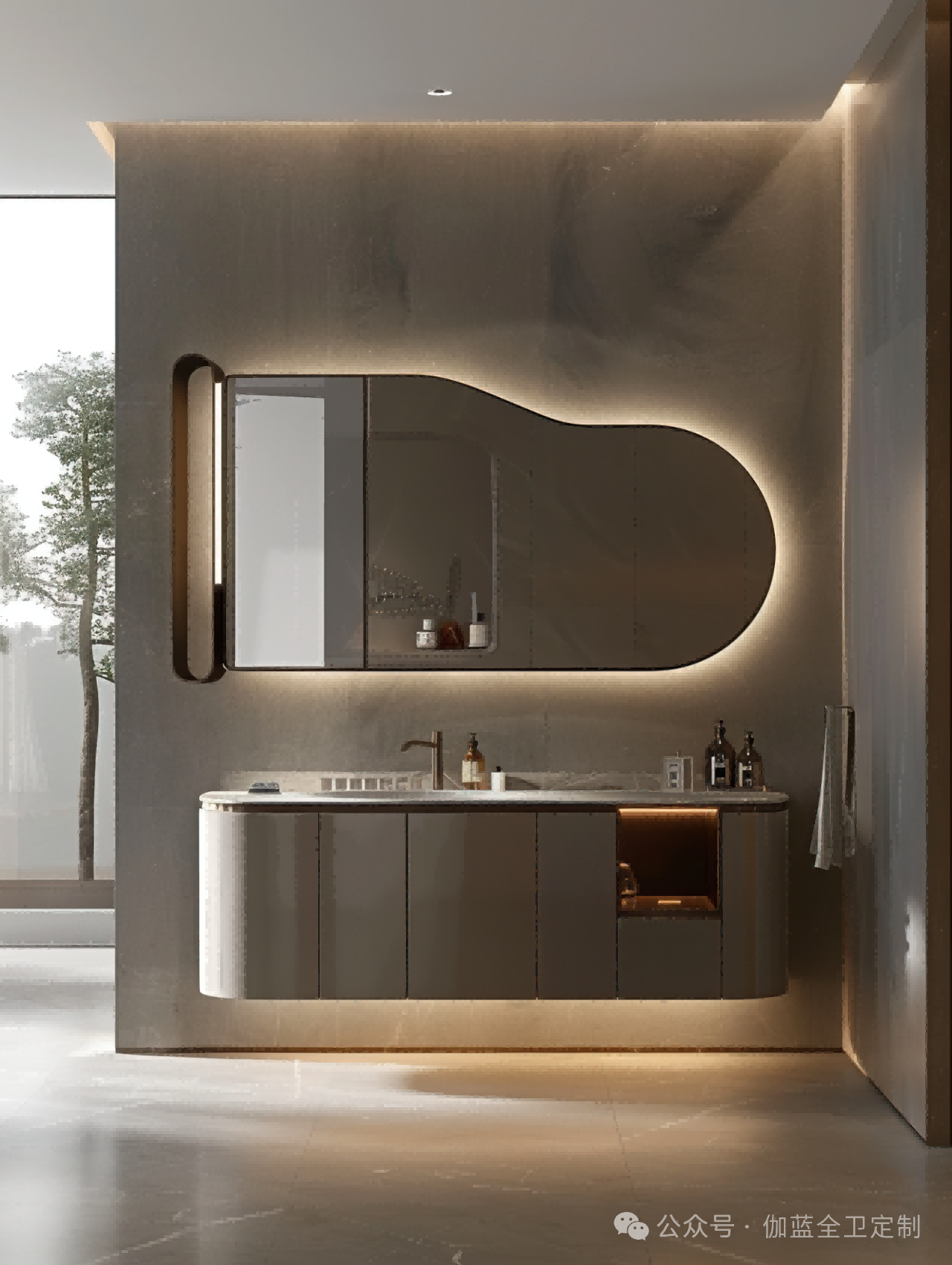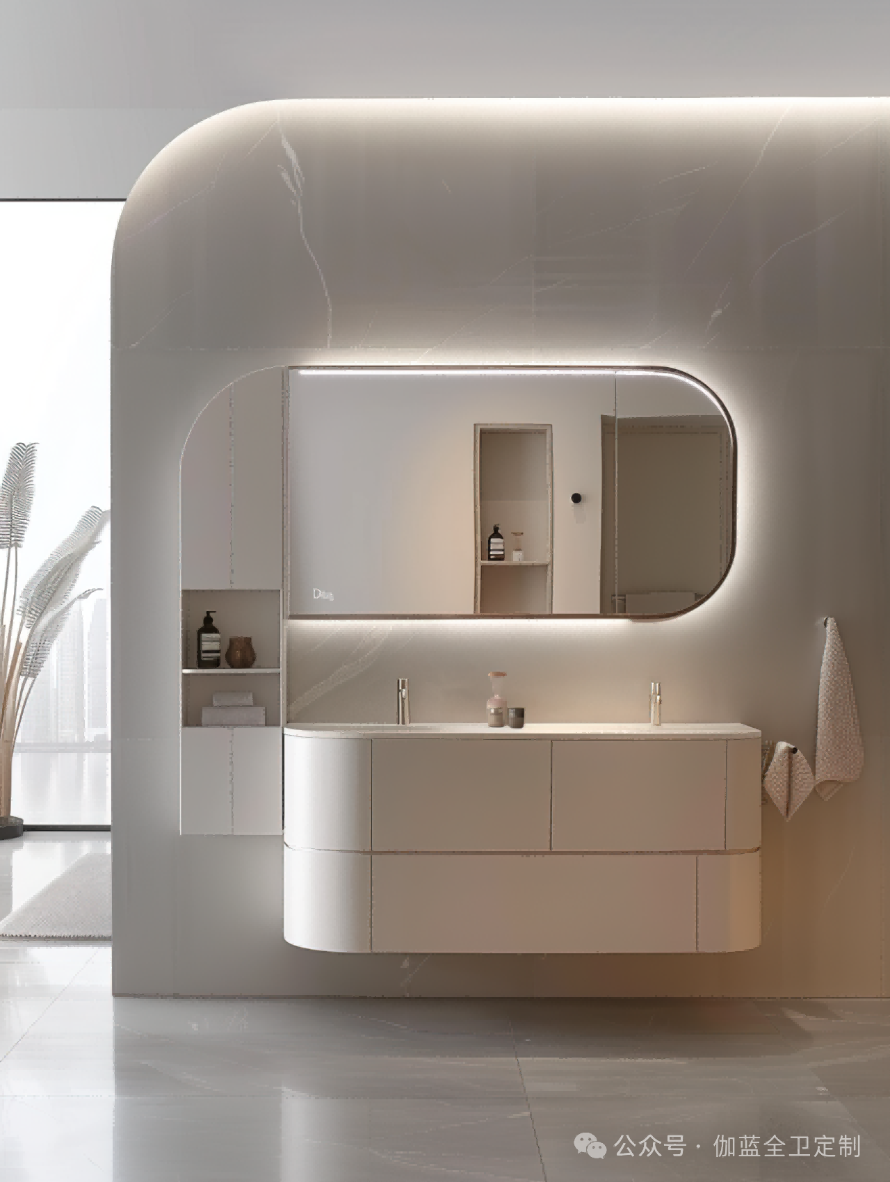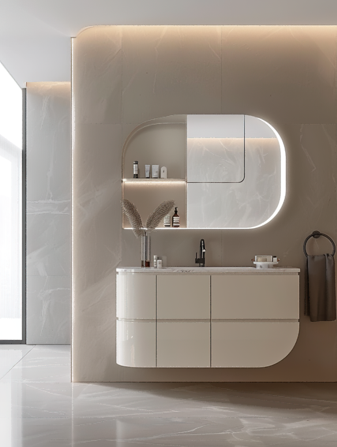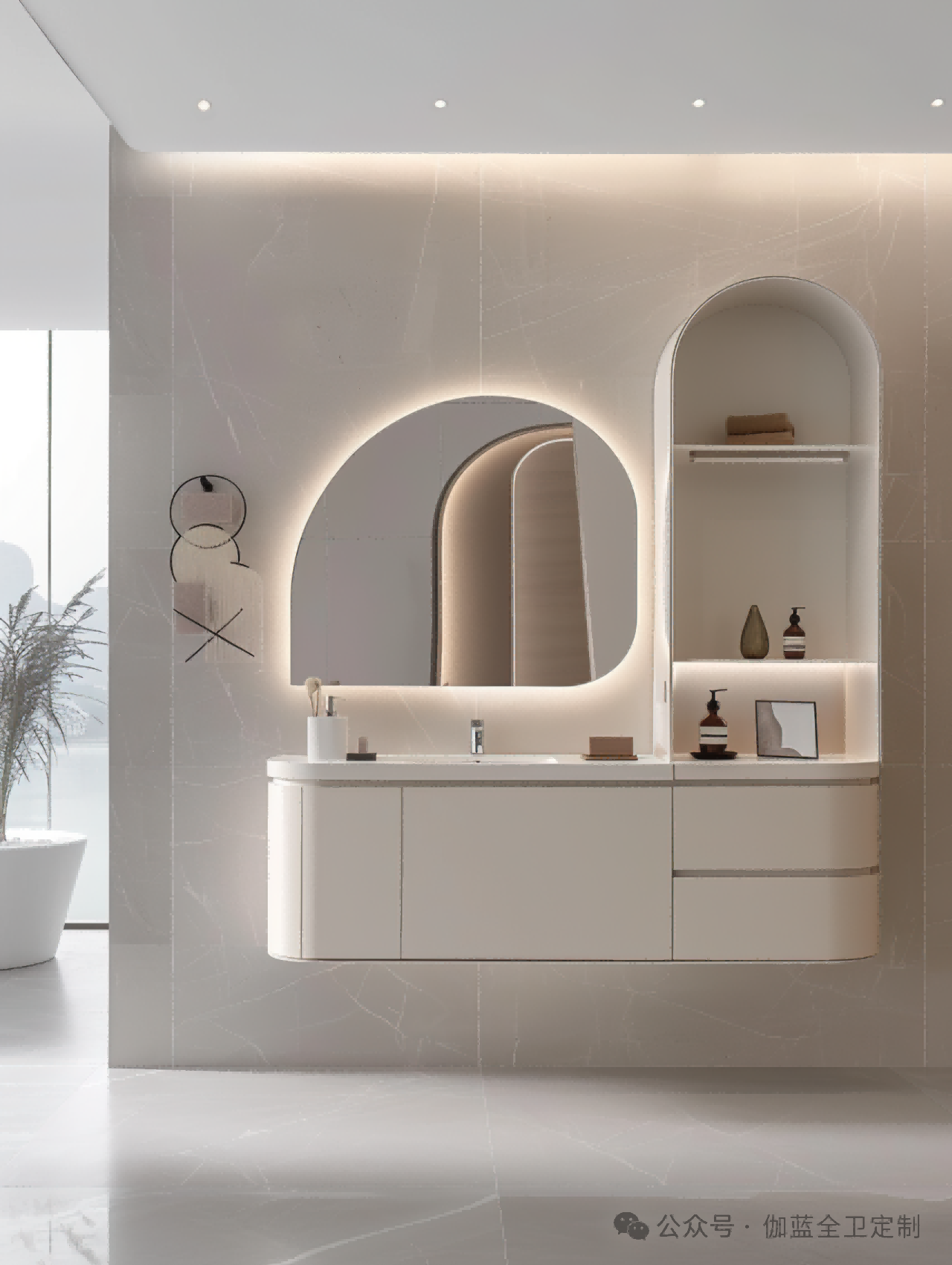 布局:柔和的弧形镜面与圆润的柜体设计相得益彰,空间布局极致简洁,却不失细节之美。