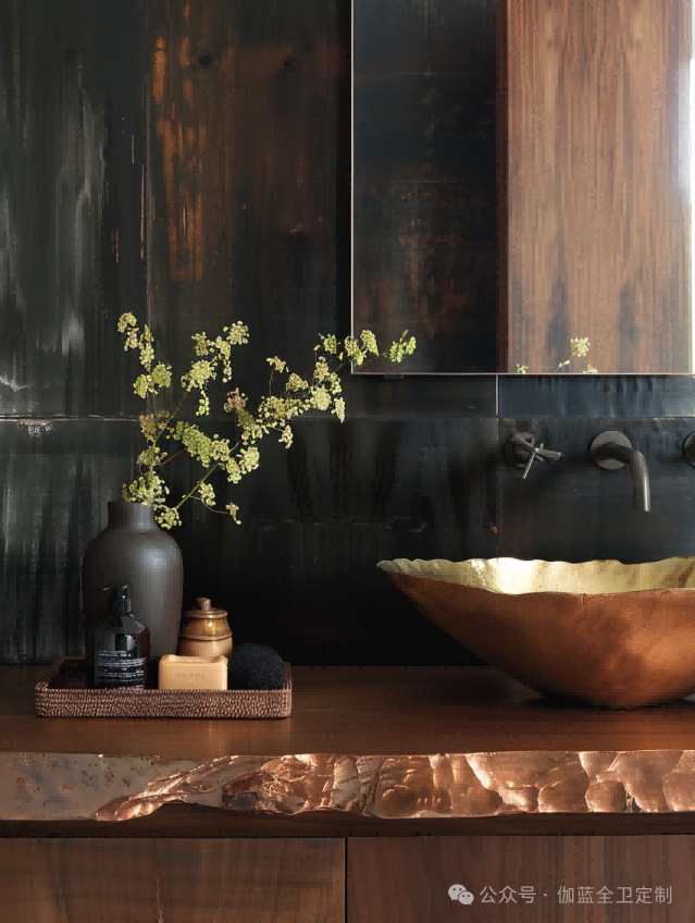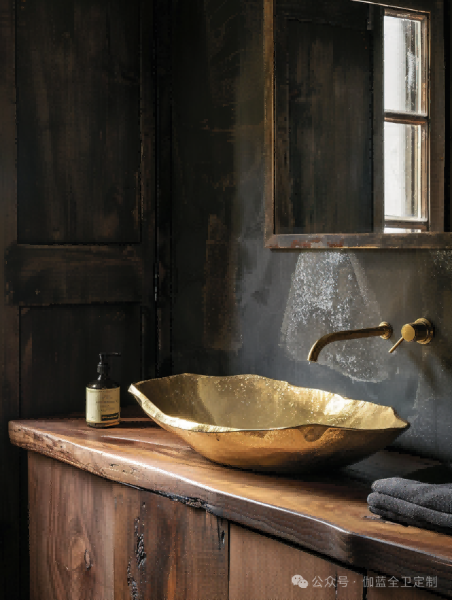 深色胡桃木与墨黑色的墙面相结合,再加上金色的洗手盆,体现了一种低调的奢华。这样的设计方案为室内空间增添了一种别样的质感,金色元素的加入则为整体设计增添了一抹亮色,提升了空间的视觉焦点。
