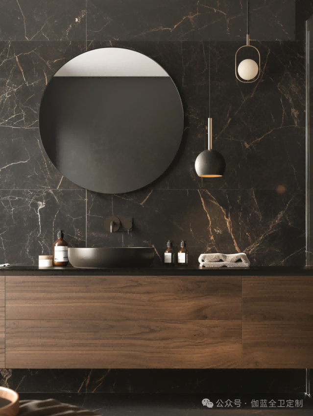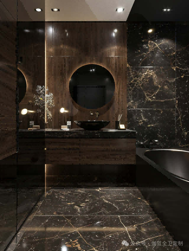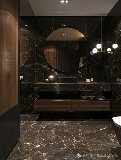 黑色胡桃木与黑金大理石相结合,营造出一种非常现代且高端的设计风格。黑金大理石给人以强烈的视觉冲击力,同时黑色胡桃木柜体的温暖木质感为这个空间带来了必要的温馨感,确保了不会过于冷硬。