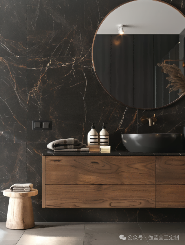 一个黑色胡桃木搭配深灰大理石墙面的浴室柜,创造出了一种奢华而沉稳的氛围。深色的胡桃木与大理石纹理形成对比,让空间中的每一件装饰都更加突出。圆润的盆和简约的龙头设计使得整体空间既现代又具有实用性。