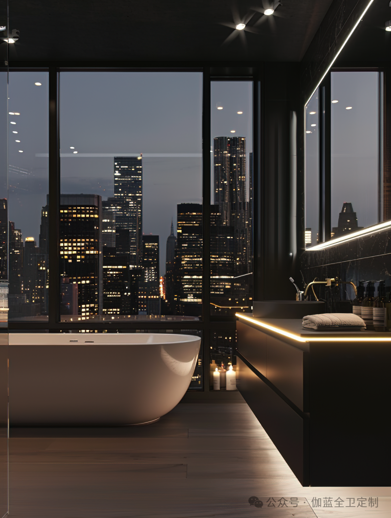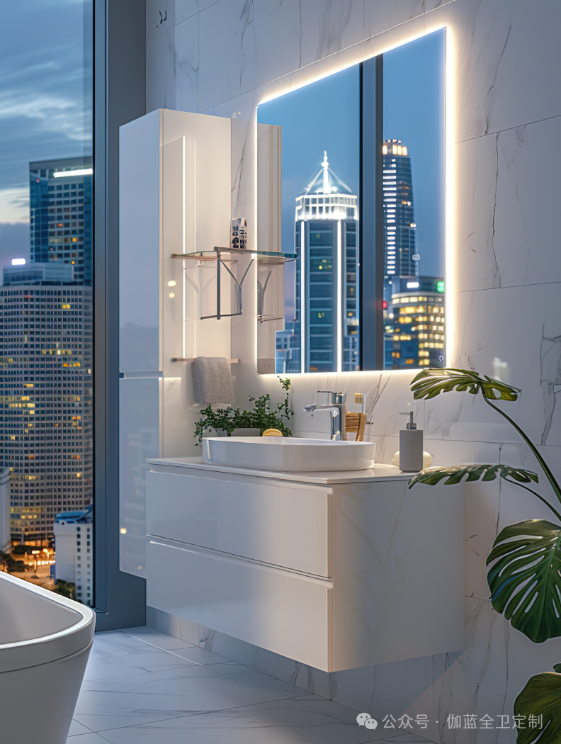 夜幕降临,城市的灯火与星辰争辉。黑暗中的闪烁,每一款浴室柜都如同夜空中最亮的星,独特的设计语言倾诉着酒店式生活的奢华与舒适。