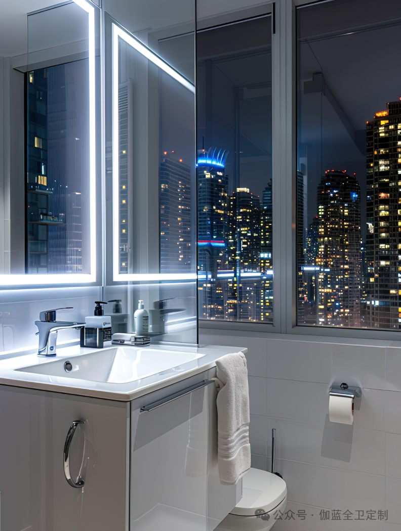 纯净的白色瓷砖映衬下的法式镜面,折射出都市夜色中的万家灯火。它不仅映照着清澈的光辉,更反射着内心深处对生活的向往与追求。