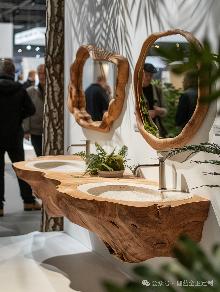 原木的自然纹理和质感被发挥到极致。不规则的镜框和厚实的原木柜体,仿佛带你走进一片宁静的森林。柜体和镜框采用天然原木材质,保留了木材的天然纹理,充满自然气息。不锈钢水龙头与原木形成鲜明对比,增添了现代感。通过这款设计,我们希望你能在繁忙的生活中,找到一片心灵的净土。