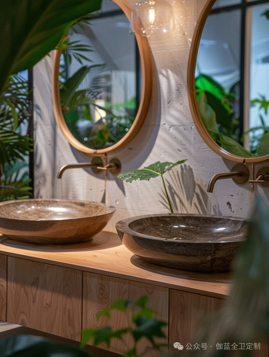 设计巧妙地将天然石材与原木结合,打造出一个既有自然质感又不失复古气息的浴室空间。石材台盆与原木柜体和镜框形成和谐统一,黄铜色的水龙头和灯具增添了一丝温暖和优雅。绿色植物的点缀更是锦上添花,仿佛置身于自然绿洲,让每一次使用都成为一次愉悦的享受。