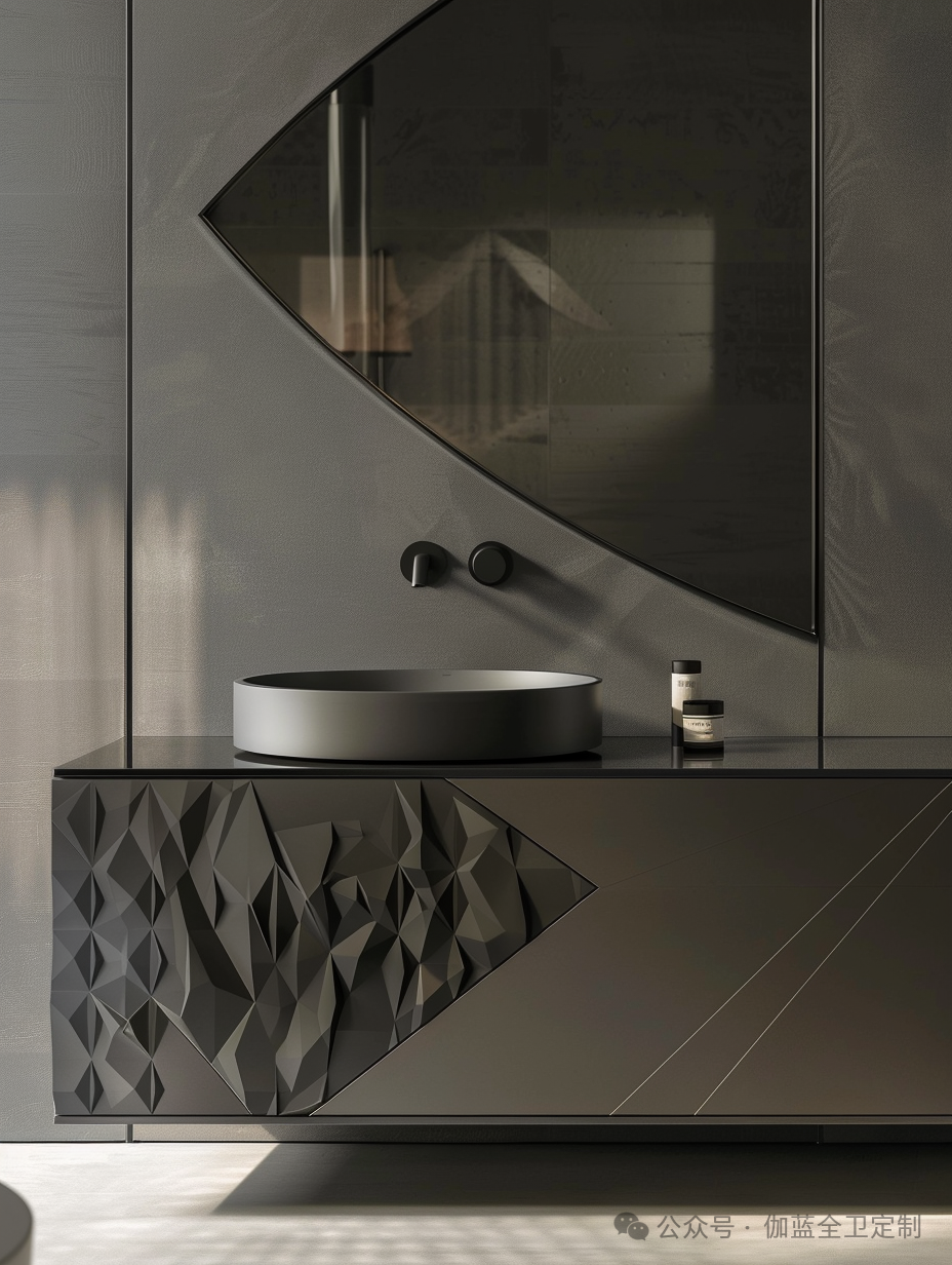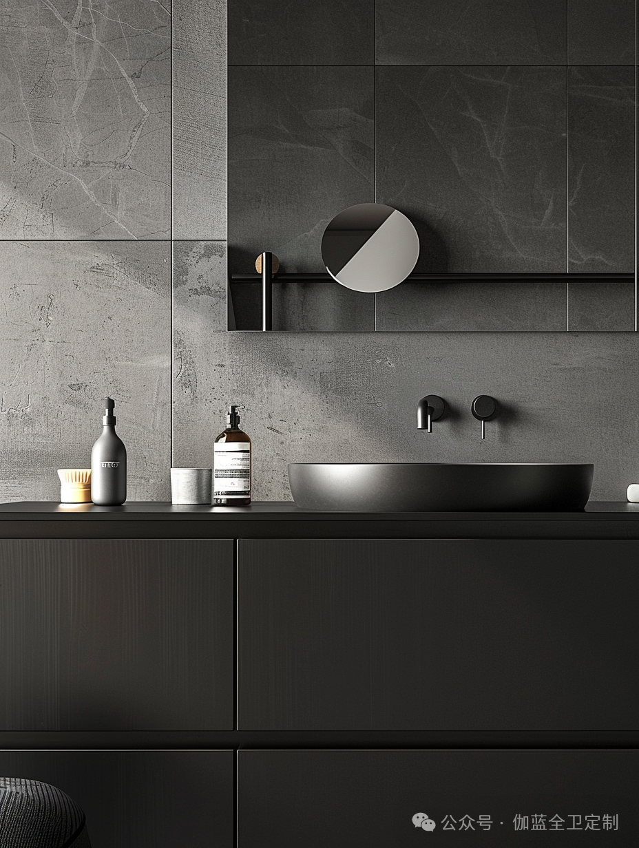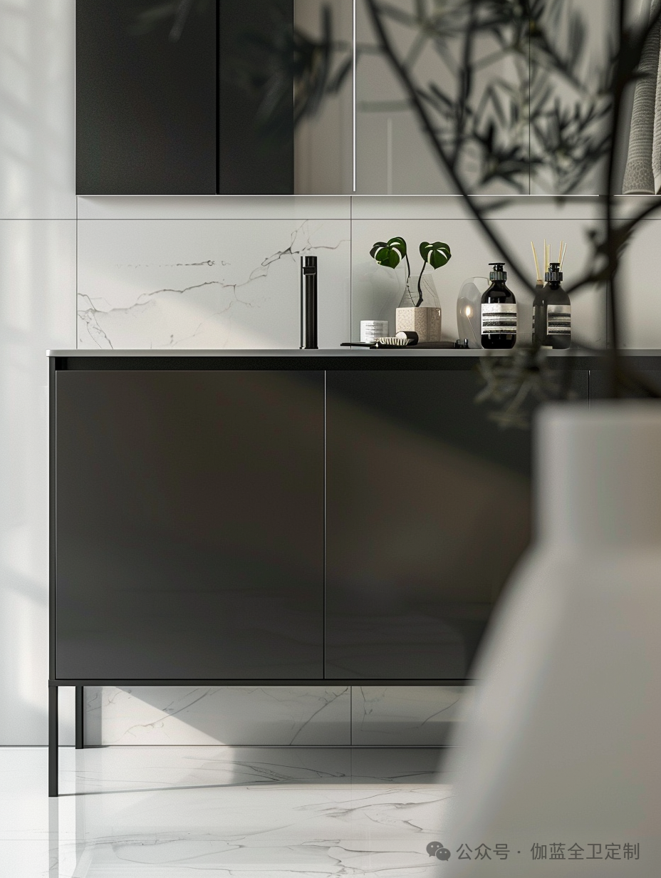 浴室柜采用了黑色磨砂材质,展现出极简与现代的完美结合。柜体设计流畅,线条干练,与纽约摩天大楼的直线美学相呼应。灯带隐藏在镜子背后,柔和的光晕为整个空间增添了一丝温暖和时尚感。黑色的墙面与柜体相互映衬,凸显出设计的层次感和深邃感。