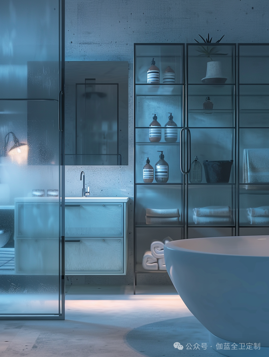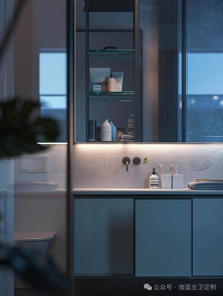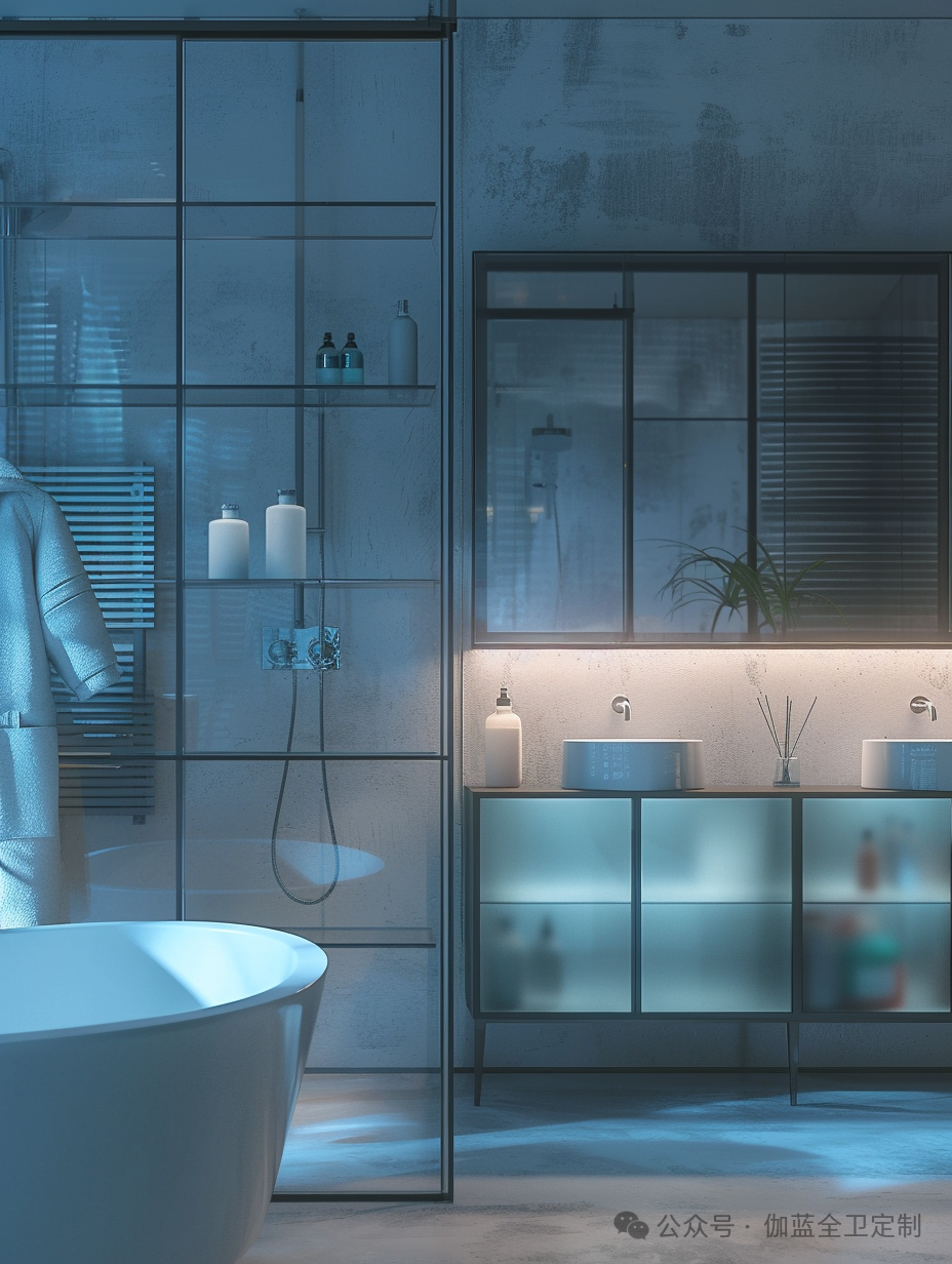 冷灰色成为主色调,象征着纽约冬季的清冷与优雅。柜体和墙面的冷灰色调相互交织,创造出一种低调而不失格调的氛围。镜子的蓝色反光与冷灰色柜体相得益彰,仿佛将纽约夜晚的城市灯光引入室内。洗手台采用简单的线条设计,呈现出纯粹的现代美感。