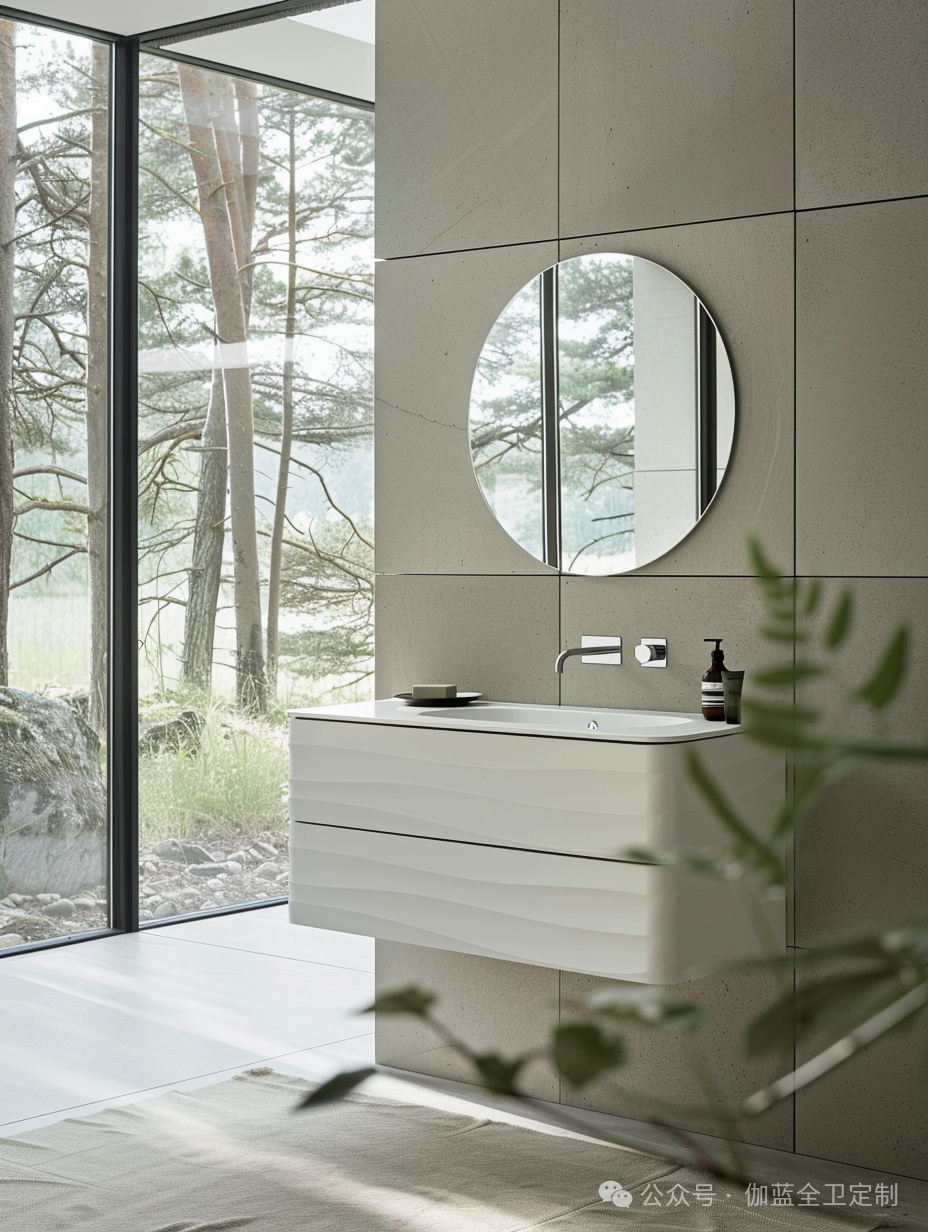 以简约自然为设计主题,白色波纹柜体与自然光线和窗外的绿意相得益彰。圆形镜子和简洁的线条设计,充分体现了北欧设计的极简主义和功能性。这里没有多余的装饰,一切都显得那么纯粹而宁静。这款设计不仅营造出宁静的氛围,更让人感受到大自然的美好。