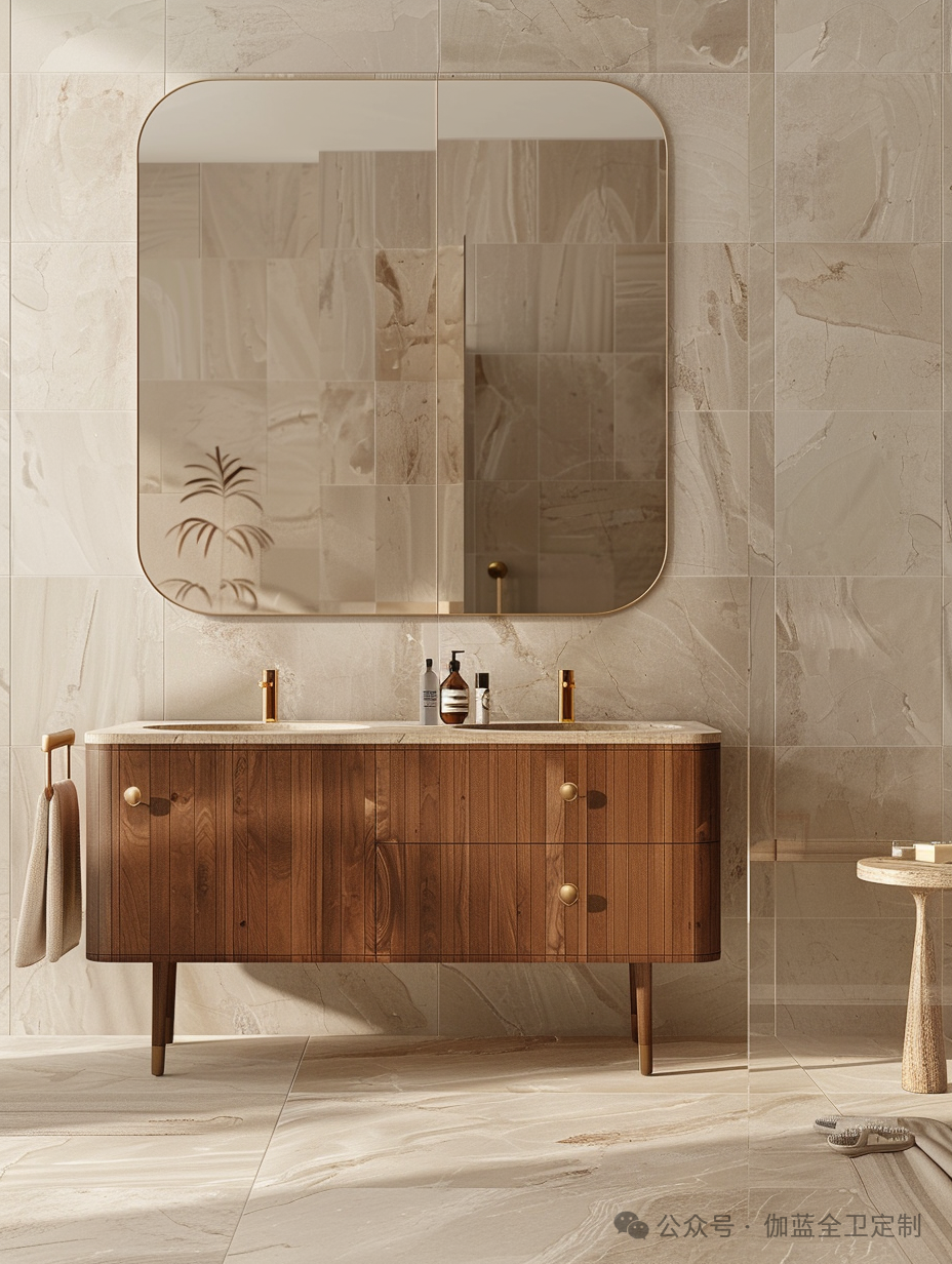 以现代经典风格为设计理念,采用温暖的木质材料和精致的金属装饰。柜体的线条简洁流畅,凸显出高雅的气质。大镜子和独特的灯具设计,使整个空间显得明亮开阔,同时又带有一丝温馨的氛围。这款设计不仅展现了现代的优雅,更让人感受到家的温暖。