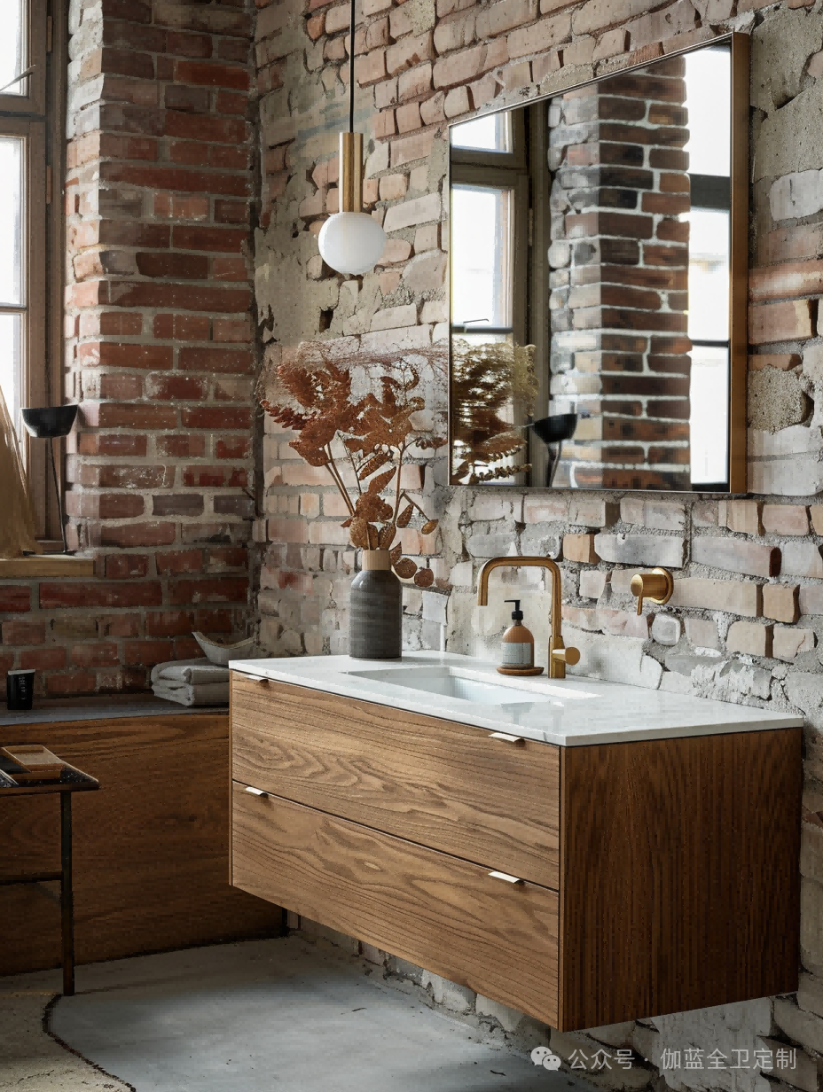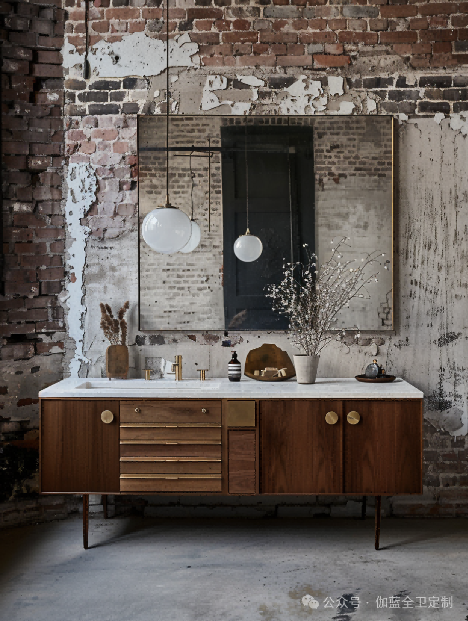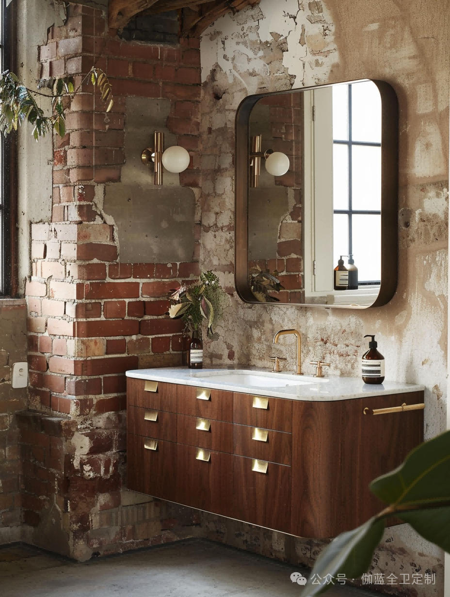 浴室柜融入了工业复古风格,结合了粗犷的砖墙和精致的木质柜体。金属与木材的结合,让空间充满了历史感和质感。简单大方的镜子设计,与周围环境完美融合,带给人一种回到过去的怀旧感,同时又不失现代感。这款设计不仅具有视觉冲击力,更让人感受到岁月沉淀下来的独特韵味。