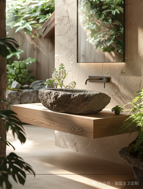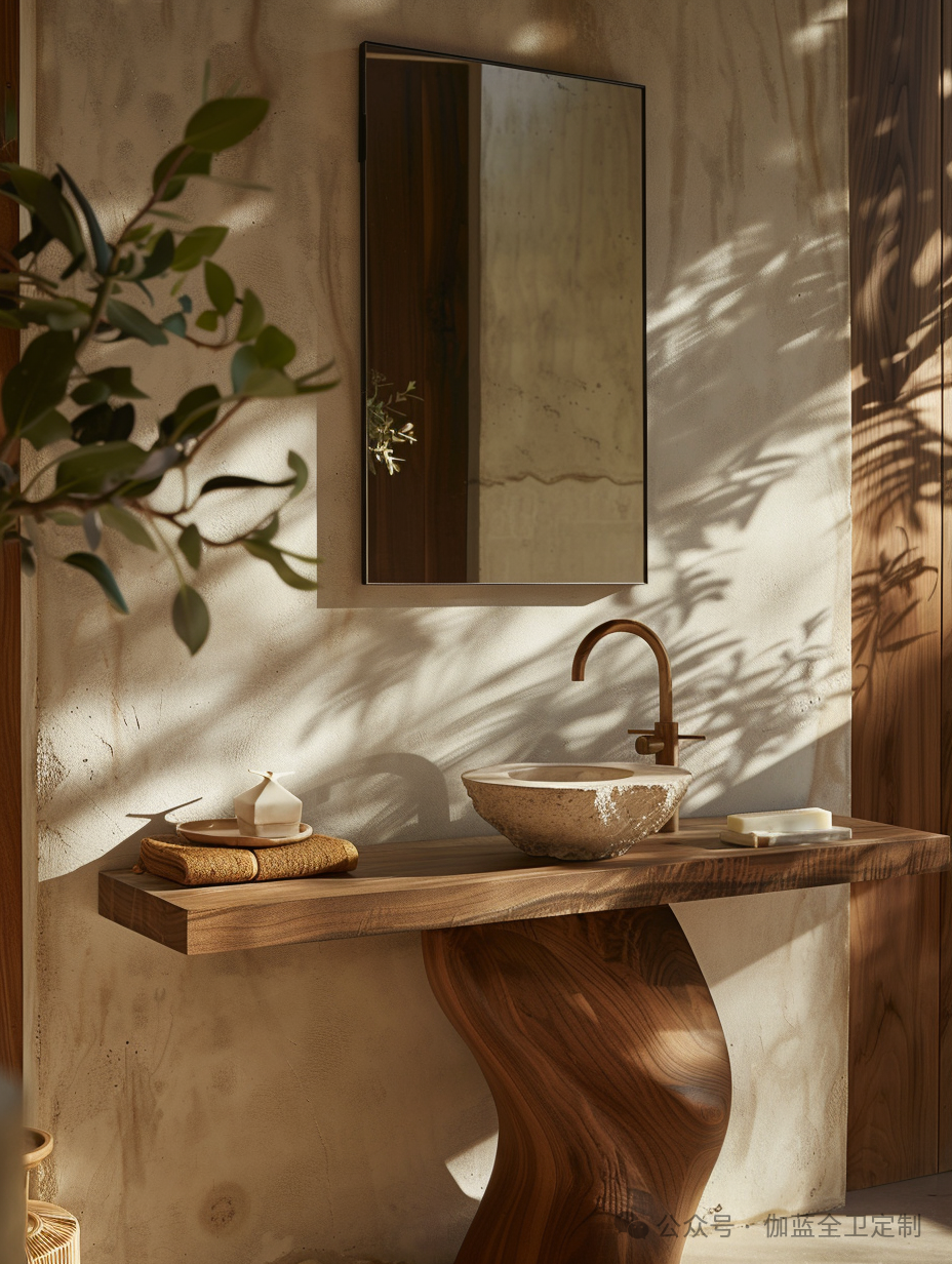 浴室柜采用天然石材和木材的组合,不仅在视觉上给人一种沉稳大气的感觉,而且通过灯光和材质的巧妙结合,使整个空间更加和谐美观。它不仅是一个独立的艺术品,更是与整个卫浴空间融为一体的设计杰作。