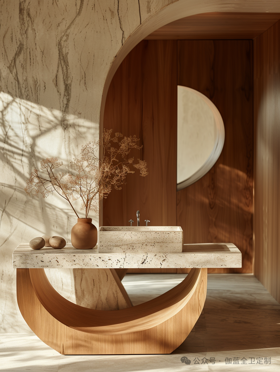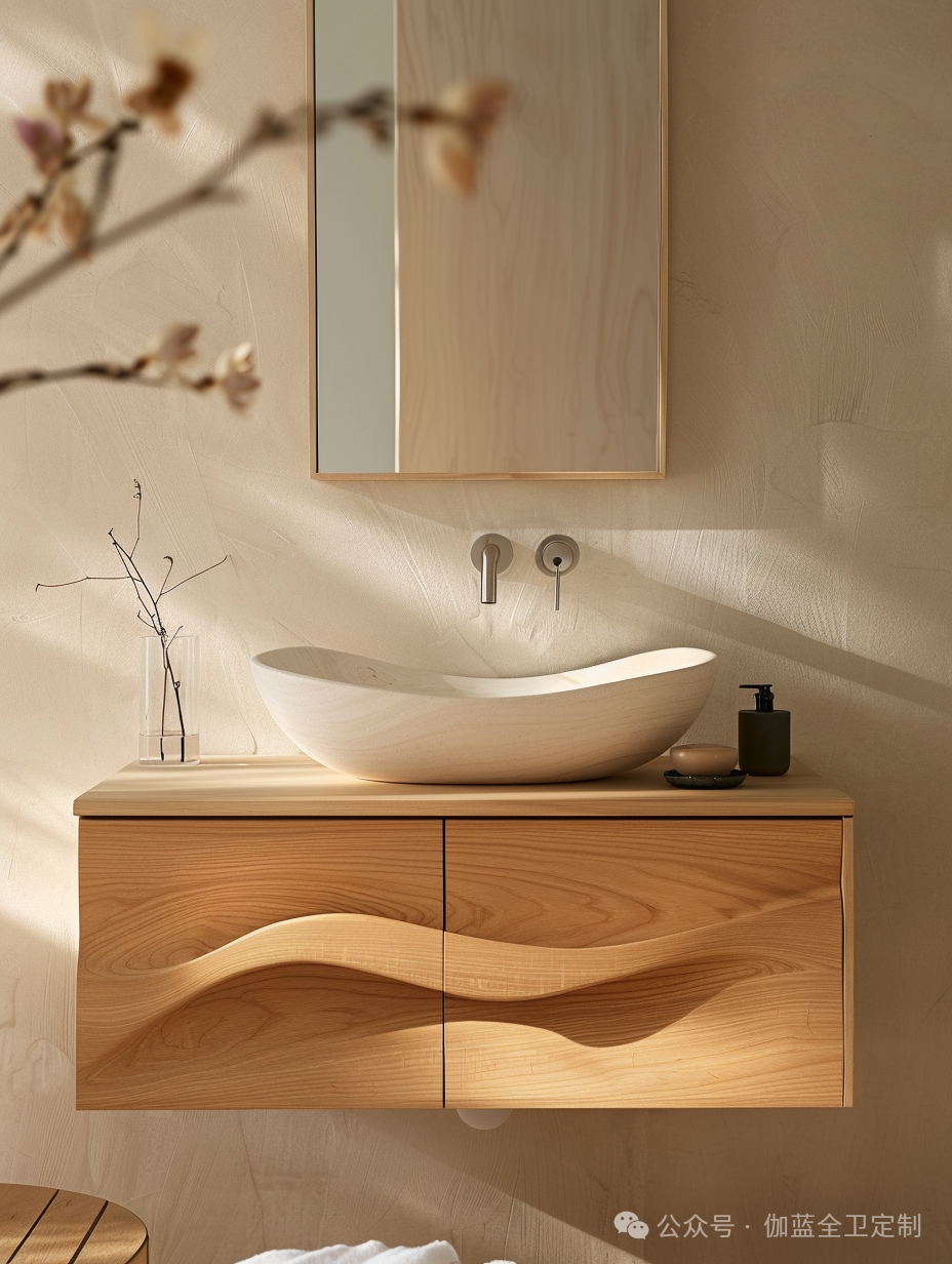 浴室柜的曲线设计灵感来源于自然界中的河流和山脉,木材的纹理和温暖的色调进一步增强了这种自然感。无论是视觉上还是触觉上,这款浴室柜都给人一种回归自然的感觉。
