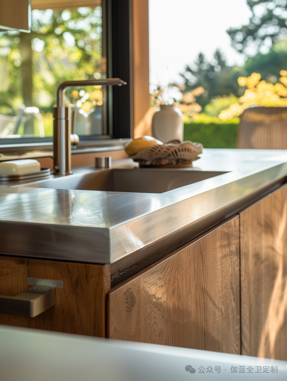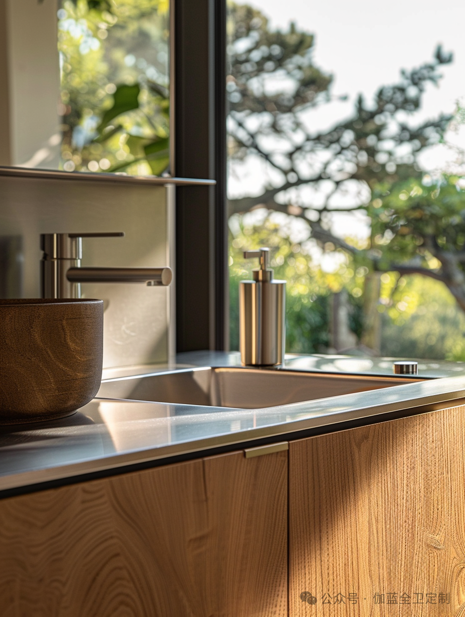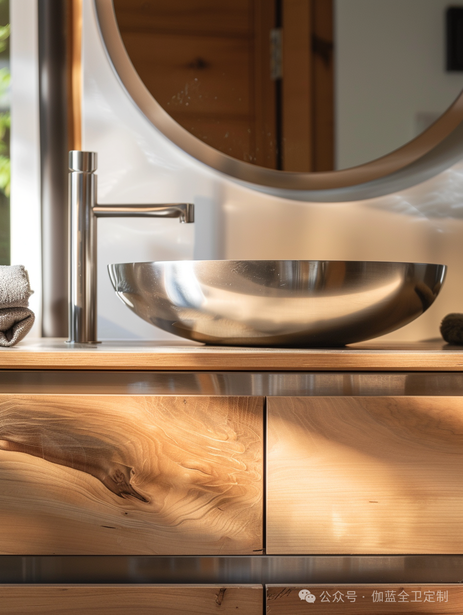 浴室柜采用了高品质的木材与不锈钢结合,形成了一个既现代又经典的设计。光滑的表面和简洁的线条不仅美观大方,而且非常易于清洁和维护,充分体现了野口勇对功能性的重视。