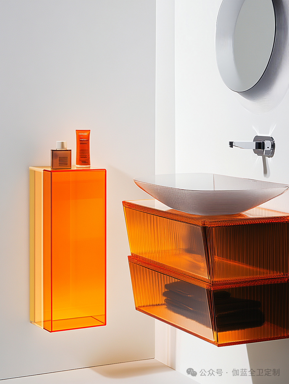 斯塔克以大胆的色彩运用著称,他的设计往往打破传统,展现出强烈的视觉冲击力。以明亮的橙色为主调,采用高科技透明材料,整个设计充满了现代感和未来感。简洁的结构和鲜明的色彩,让这款浴室柜在简约中透露出独特的时尚气息。