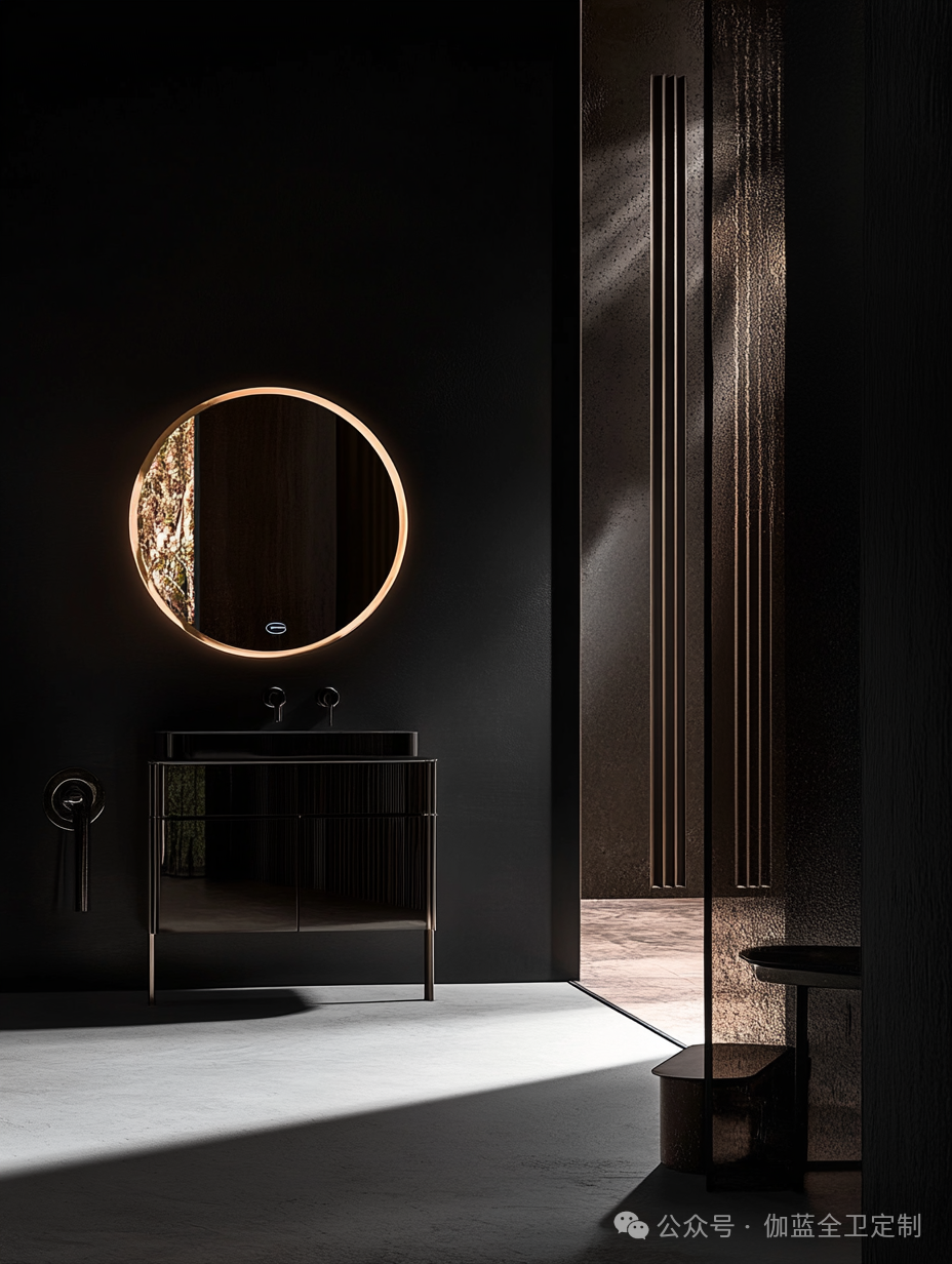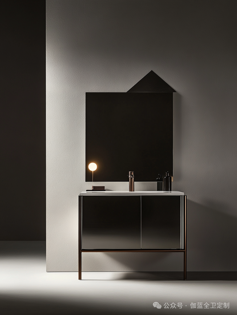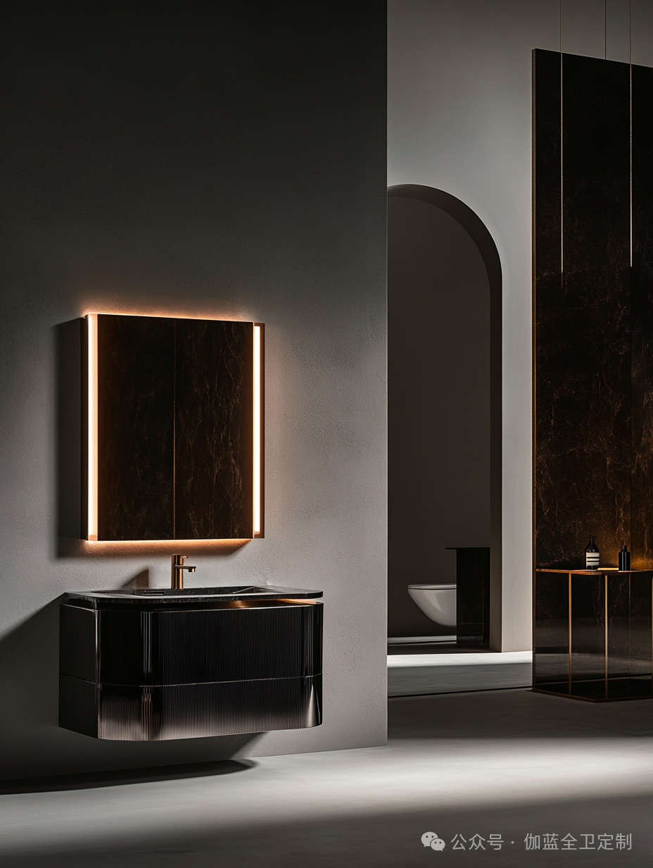 斯塔克擅长使用高科技材料,并以创新的方式将其融入设计中。采用了高光漆面和镜面不锈钢材质,整体设计极简且前卫。独特的结构和照明设计,使得浴室空间充满了现代科技感与艺术氛围。