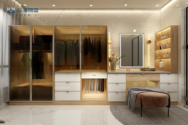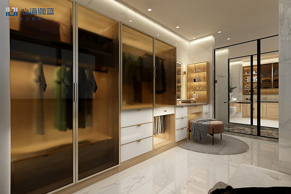 另一个空间用来放女主人的衣服配饰绝对够霸气,并排两个超大衣柜,大衣长裤统统都能挂起来,下方层层抽屉,丝巾帽子小配件都能分类储放。直接连着个梳妆台,梳妆打扮一条线过去,不用来回进出,哪怕是晚上卸妆洗澡都能一步到位!