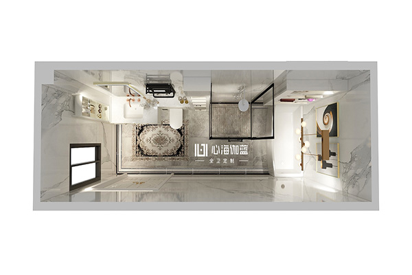 一字形布局功能区,顺序按梳洗区、马桶区、淋浴房、浴缸以此排列。为适应大部分人群的行为动线,把最频繁使用的洗手台跟马桶放在最外面靠门处,较少使用的浴缸放在最里面。