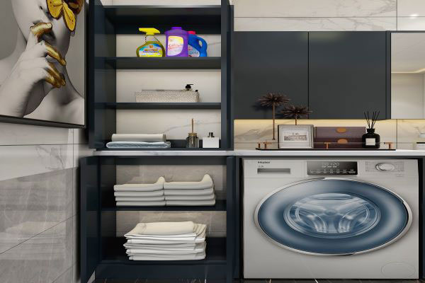 侧柜闭合空间整洁,侧柜打开便是上下分格的储物柜,毛巾、洗衣液、衣领净等都可放置其中,让洗衣机的使用更加便捷。