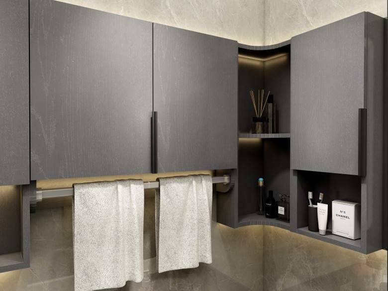 利用墙面空间做开放+闭合式壁柜设计,常用品和备用品结合储存空间,不必担心浴巾、毛巾、洗发水、洗衣液、沐浴露、护肤品等物品会把空间搞得乱七八糟,心海伽蓝全卫定制合理设计帮你解决。