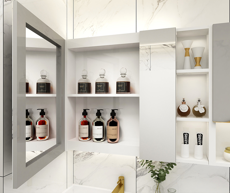 【功 能】:镜柜增加储物空间的同时也拉大空间视野;洗漱柜右侧添加开放格,存放纸巾和手机;台面一体衔接,添加存放位置