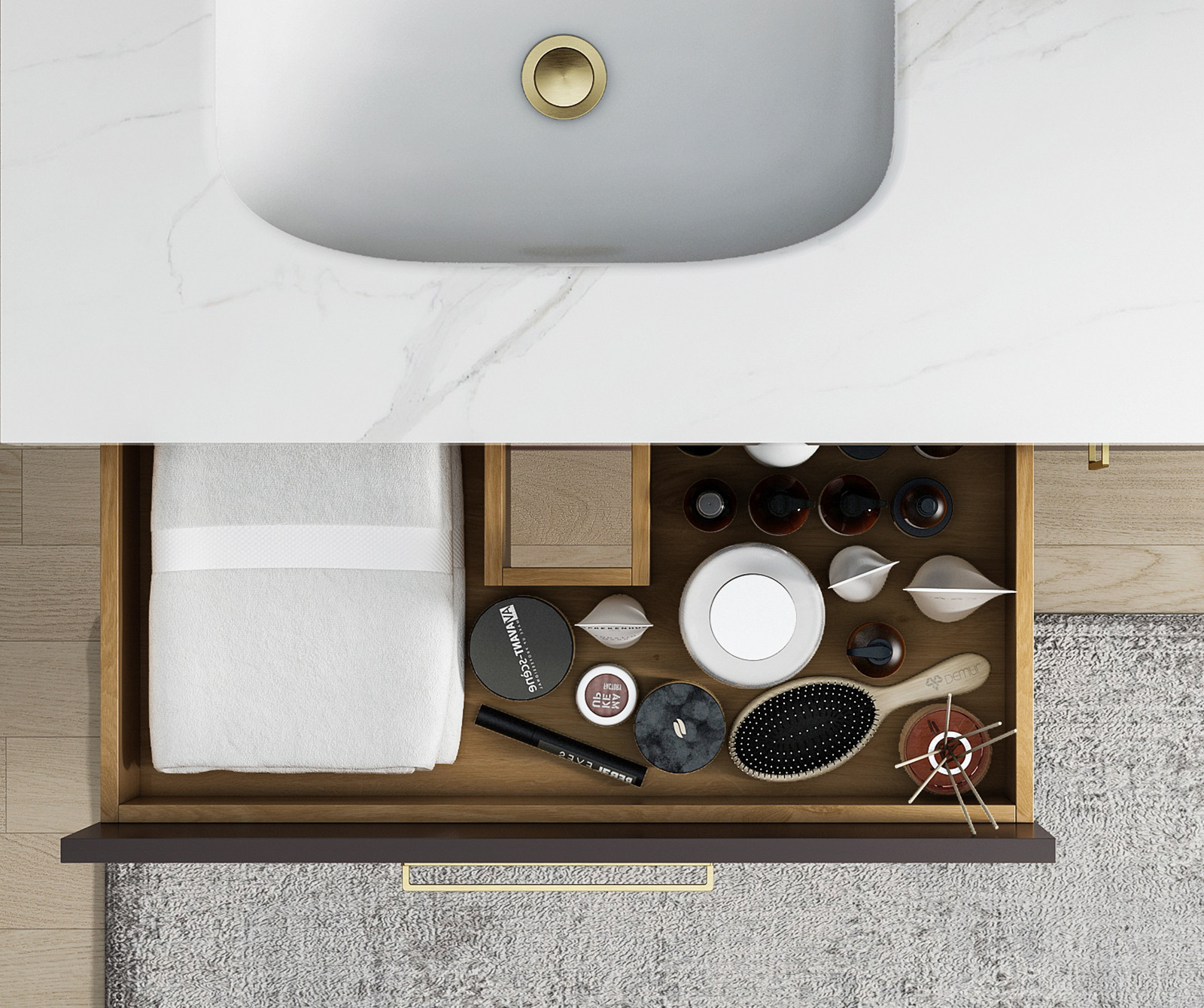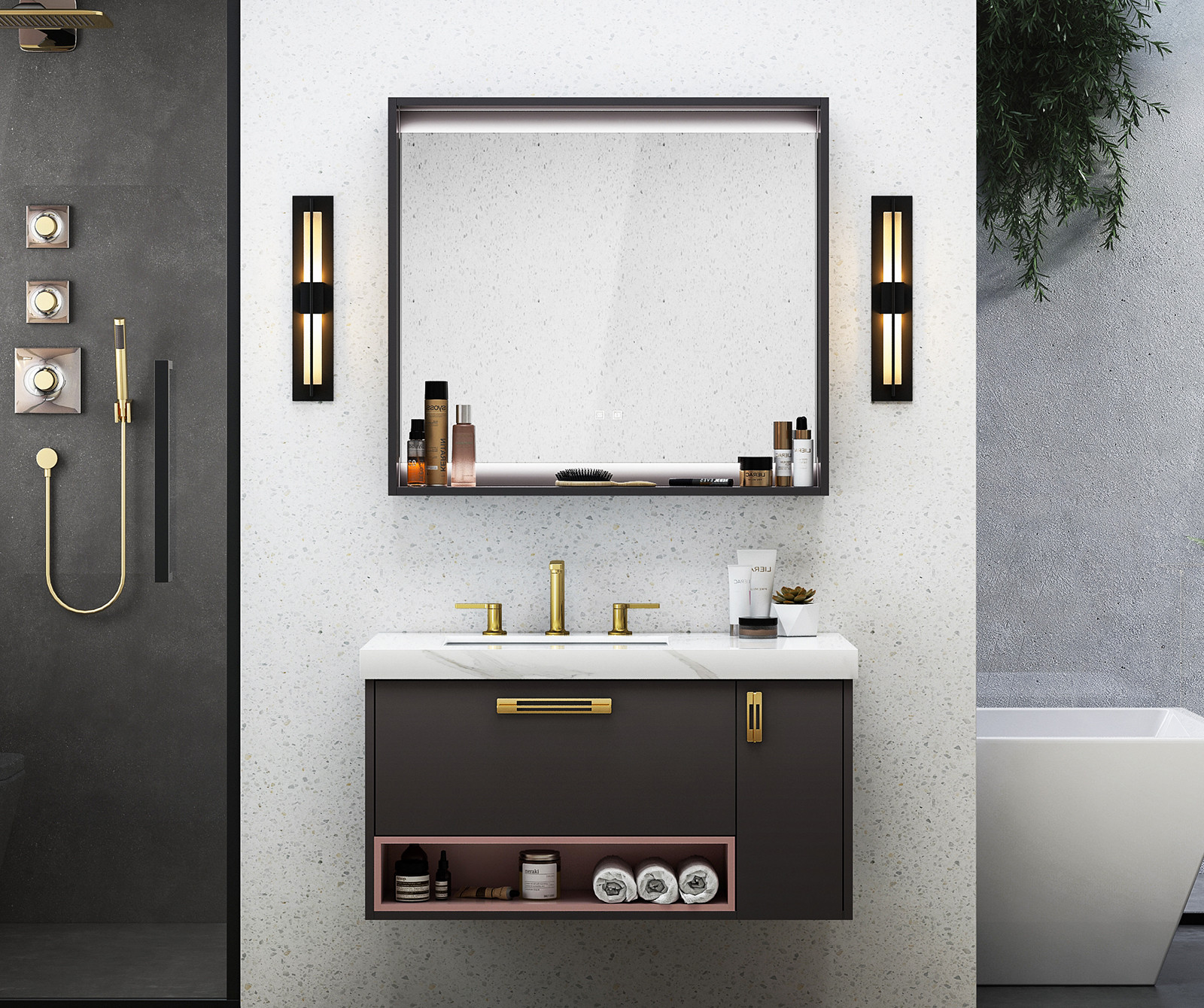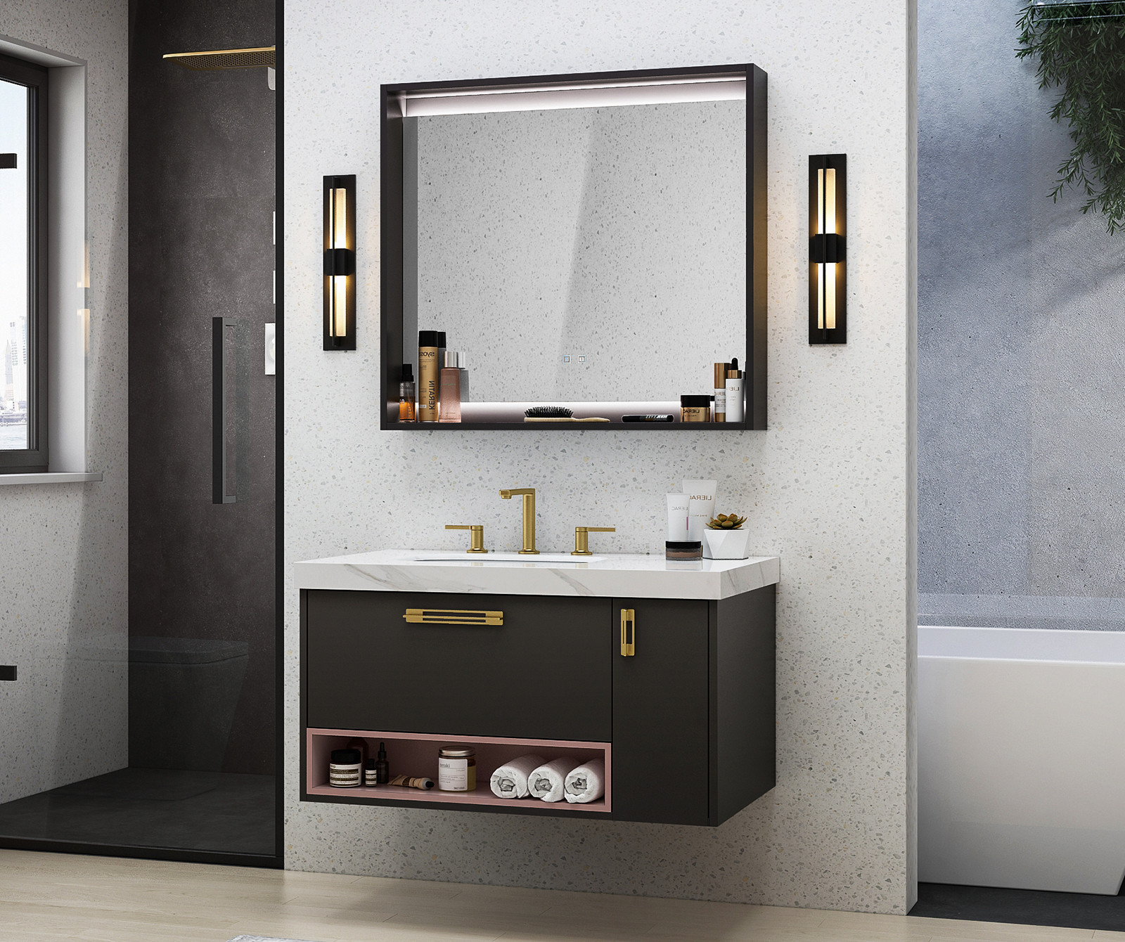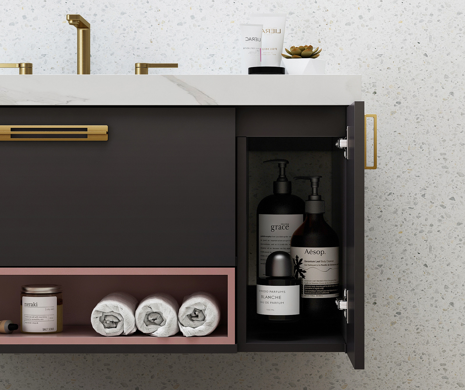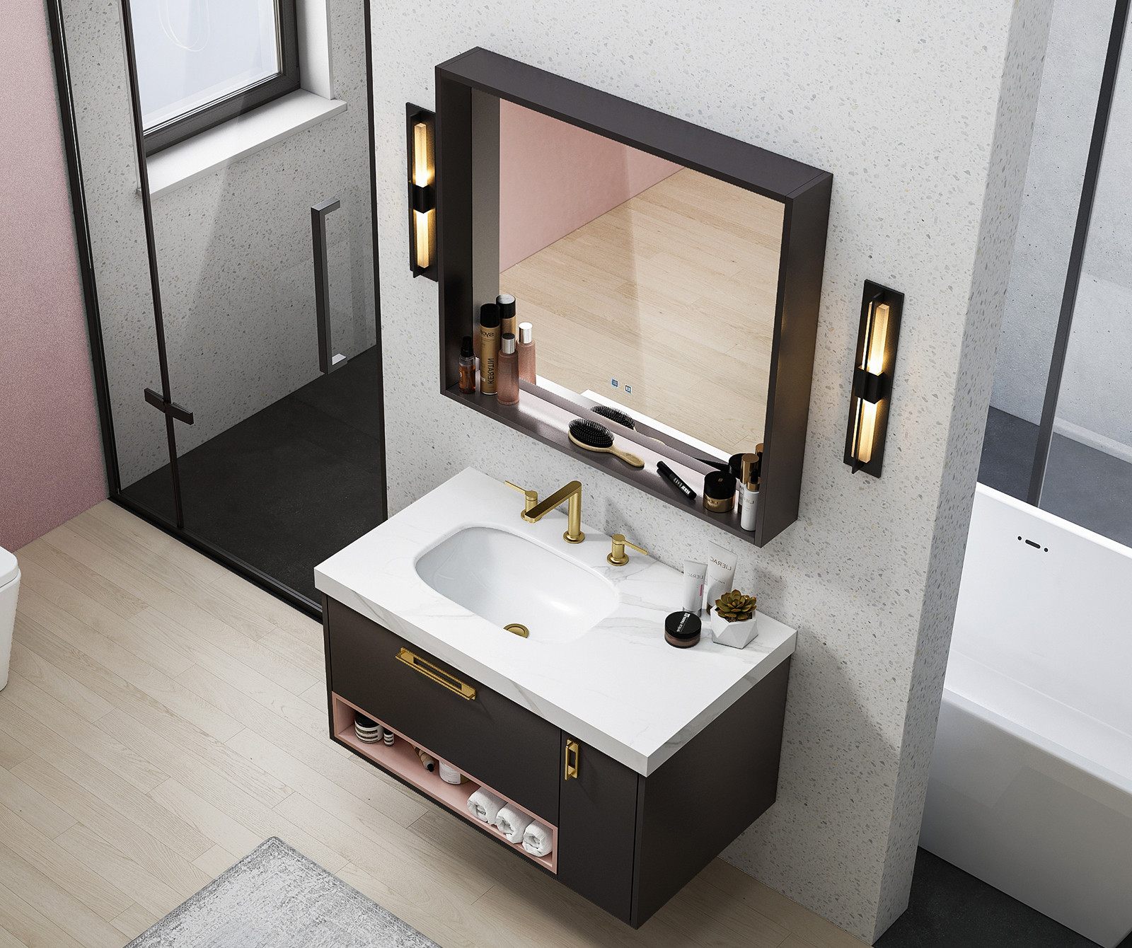 【主柜颜色】:石墨灰 + 樱草粉 + 抽屉清漆色