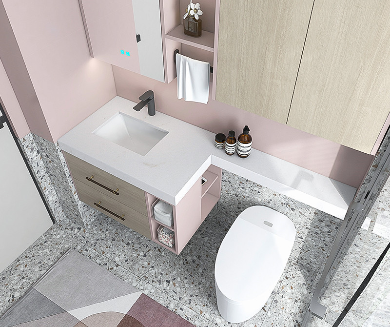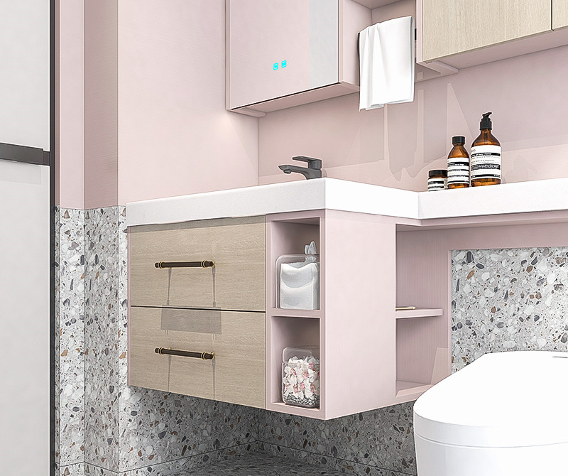 【功 能】:上方墙面组合式智能镜柜;马桶边前边,侧边开放格设计方便拿取两方物品;台面延伸到马桶上方,更好利用马桶上方空间