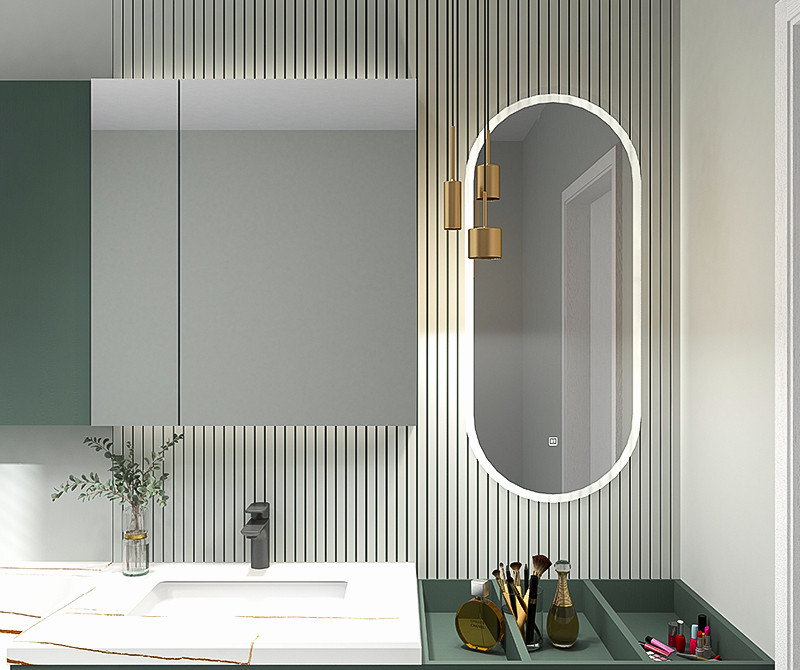 【功 能】:跑道圆镜面自带灯光即可全方位映照美貌;梳妆格区隔分明,收纳明确;镜柜大容量收纳,琐碎物品都能装;浴室柜和坐便器悬空不留卫生死角