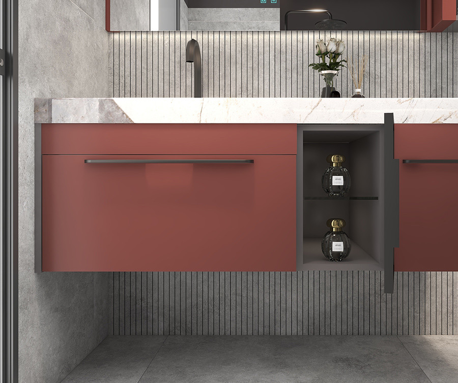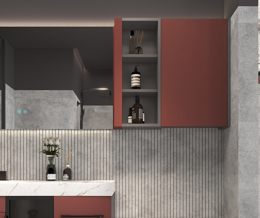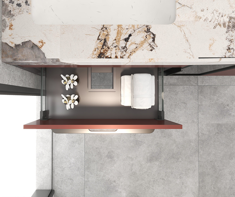 【功 能】:组合式联排智能镜+吊柜;卷轴式实木边框 大面积背发光镜面;拓宽小面积空间的 视觉观感,更显通透宽敞