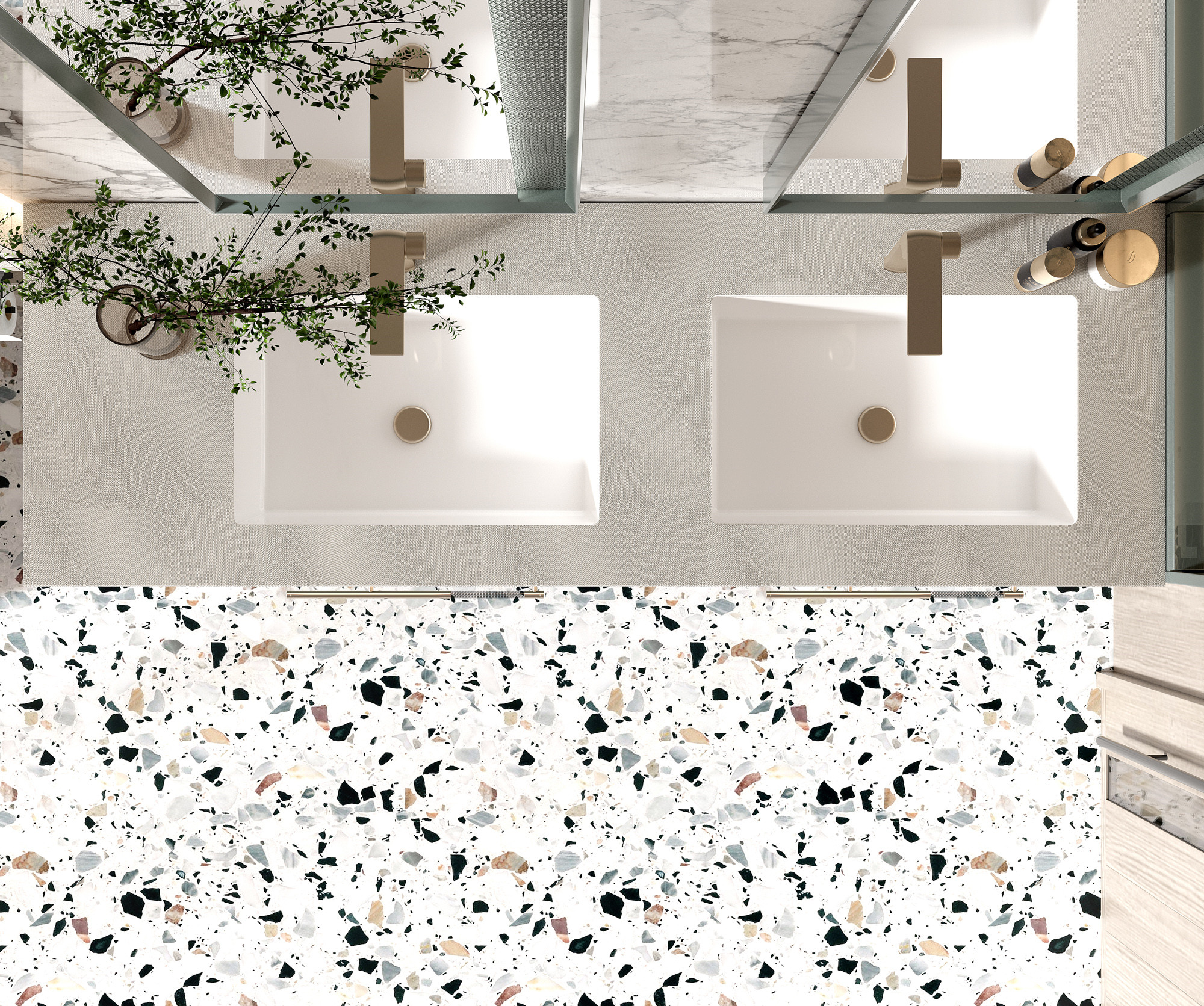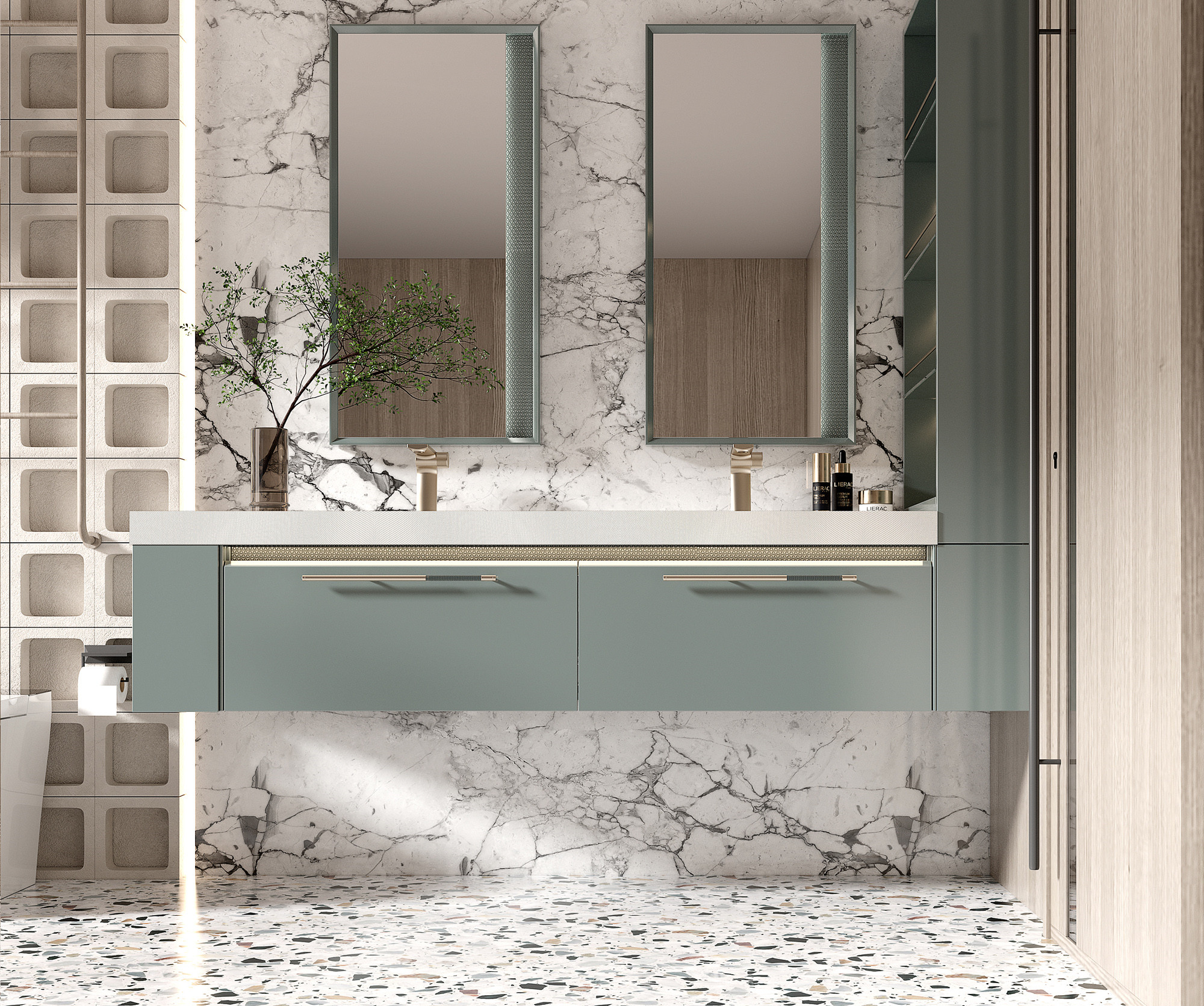 【功 能】:双镜搭配三角形浮雕几何纹理外框,侧发光设计平衡窗户日光的光线不匀问题;采用无缝拼接盆;梳妆带灯玻璃层板梳妆高柜,减少不必要的柜门开合。