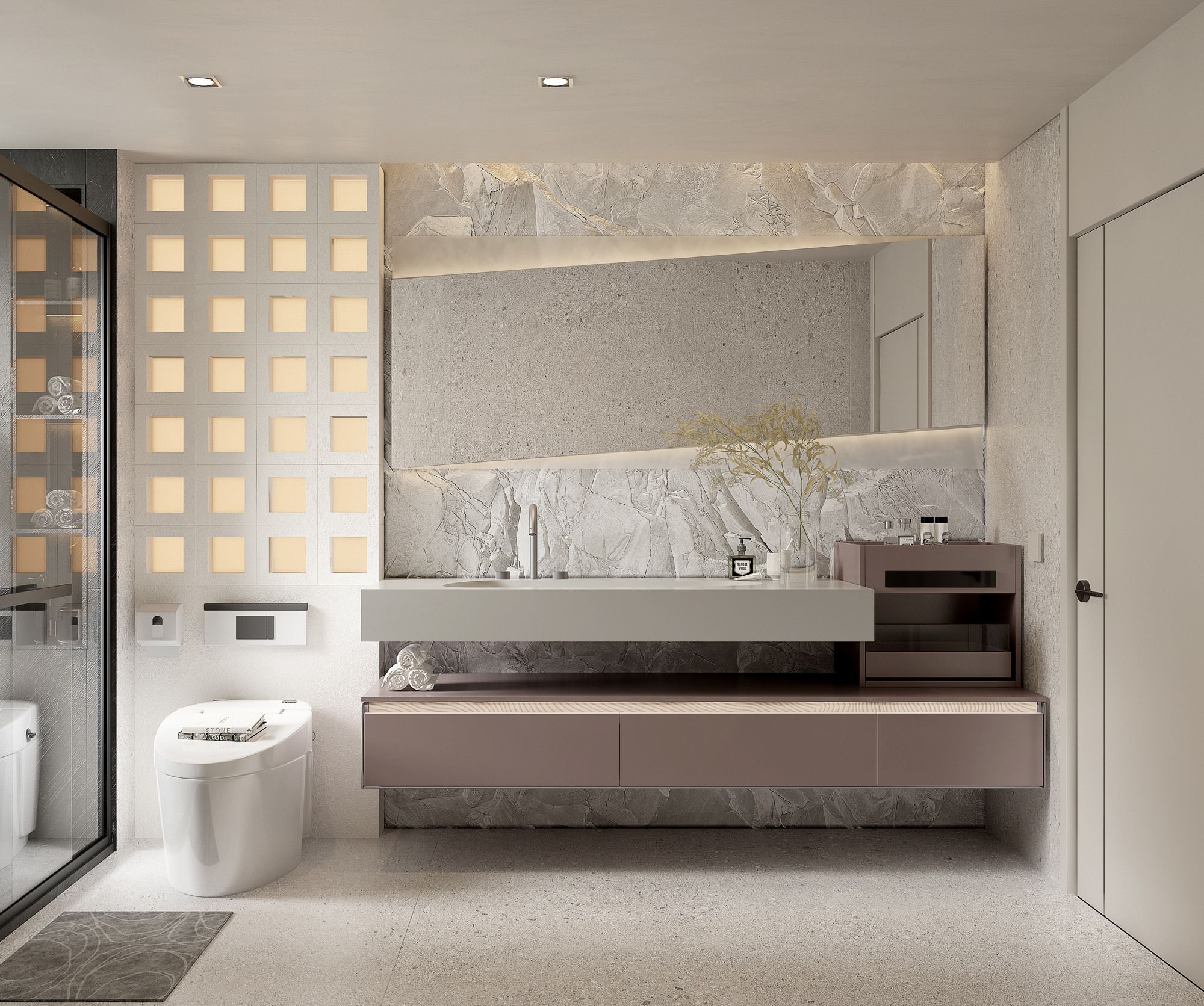 【功 能】:超大盆腔;植入消毒烘干机:洗漱完毕可将贴身衣物烘干;一片式前发光智能镜全包围细边发光区,日常使用更聚光更清晰增加蓝牙语音功能。